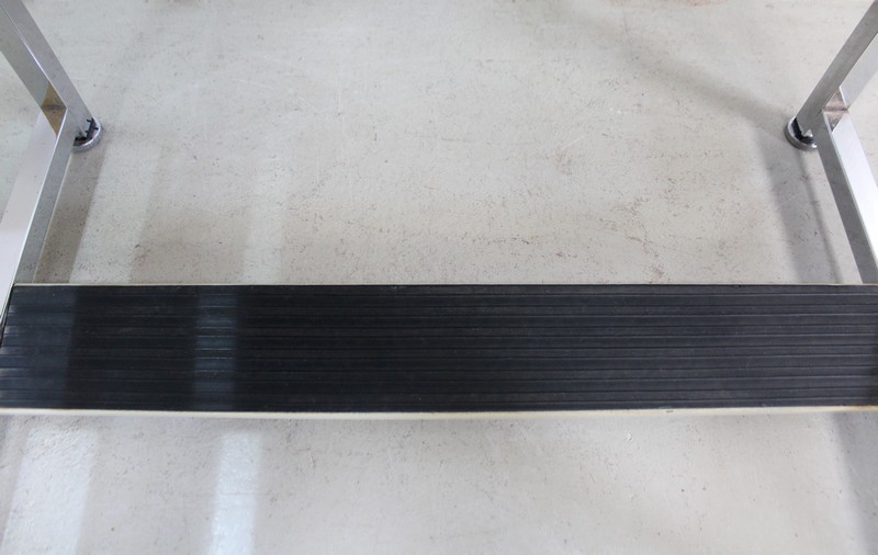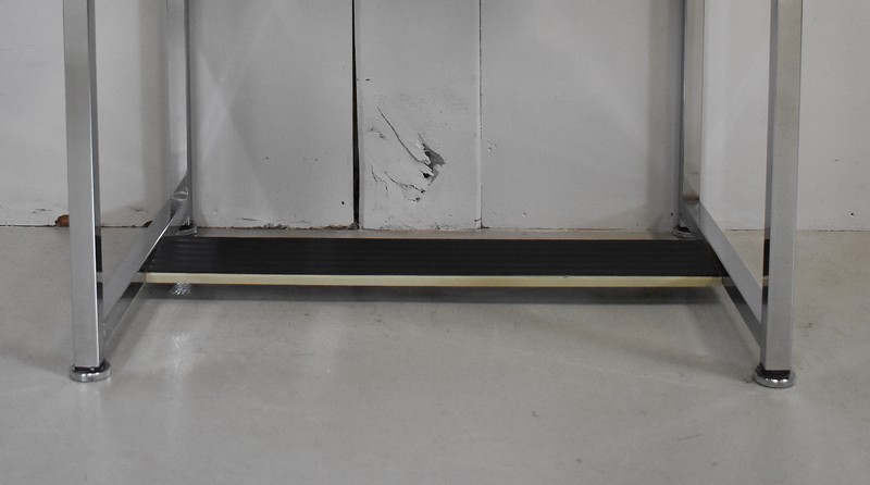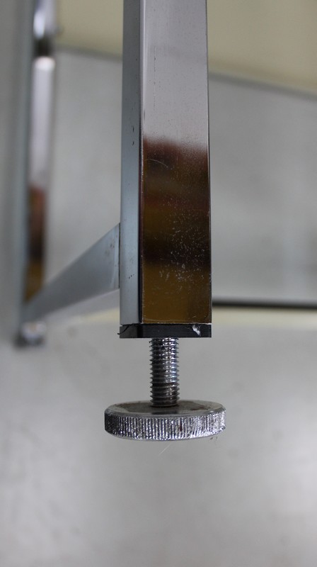 Les pieds sont reliés par paire sur les côtés par des traverses en Métal Chromé, elles mêmes réunies par une Entretoise centrale. Cette dernière est recouverte d’un Caoutchouc antidérapant.