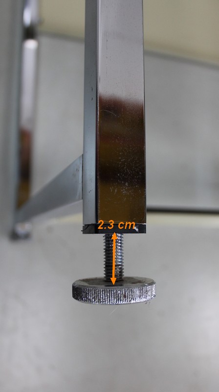 On notera que l’ensemble est Ajustable en Hauteur sur 2.5 cm, puisque chacun des quatre pieds est pourvu d’un pas de vis Réglable indépendamment. Ce système présente l’avantage évident d’avoir un Bureau Modulable en fonction de la taille de son utilisateur, mais également droit en toutes circonstances, non bancal, même sur un sol un peu irrégulier.
