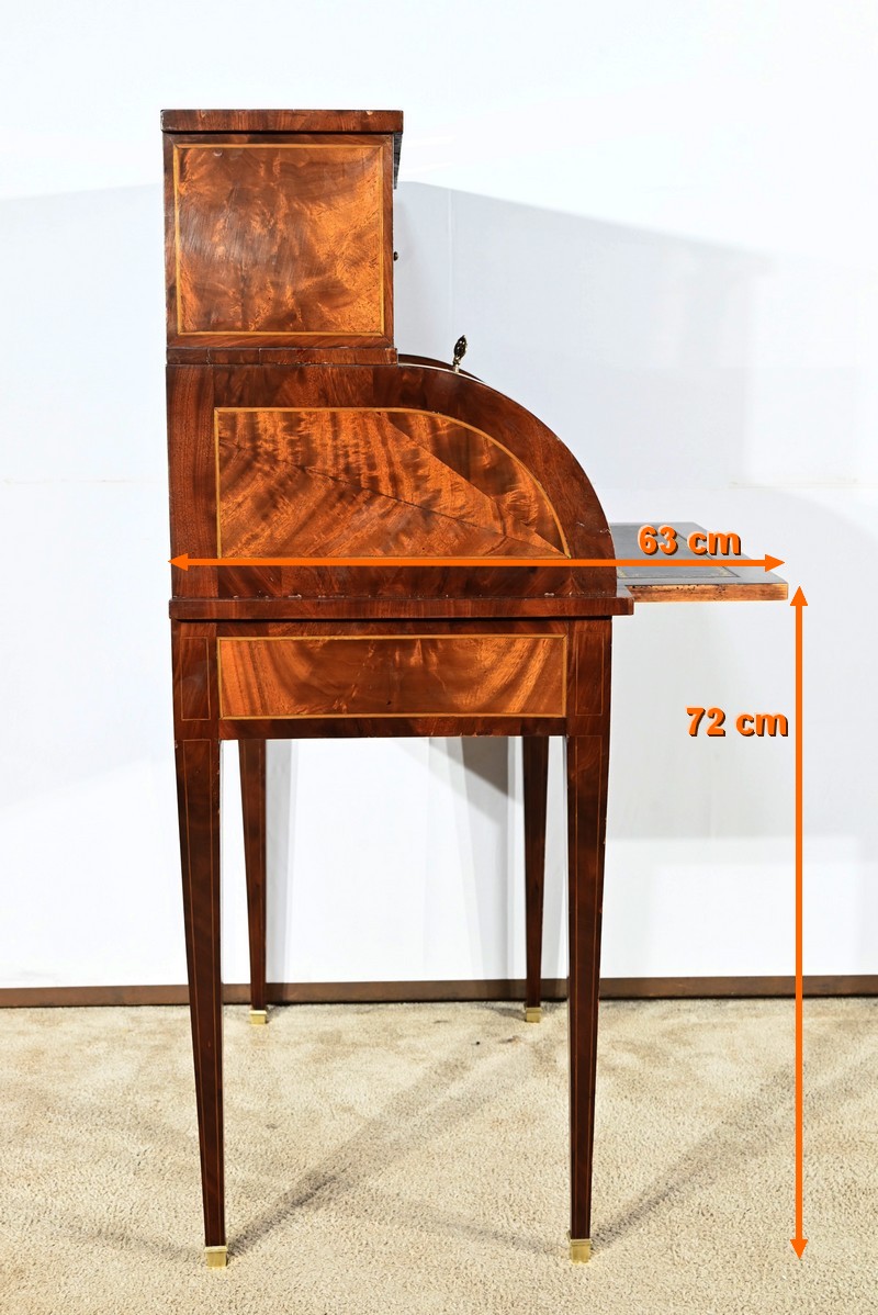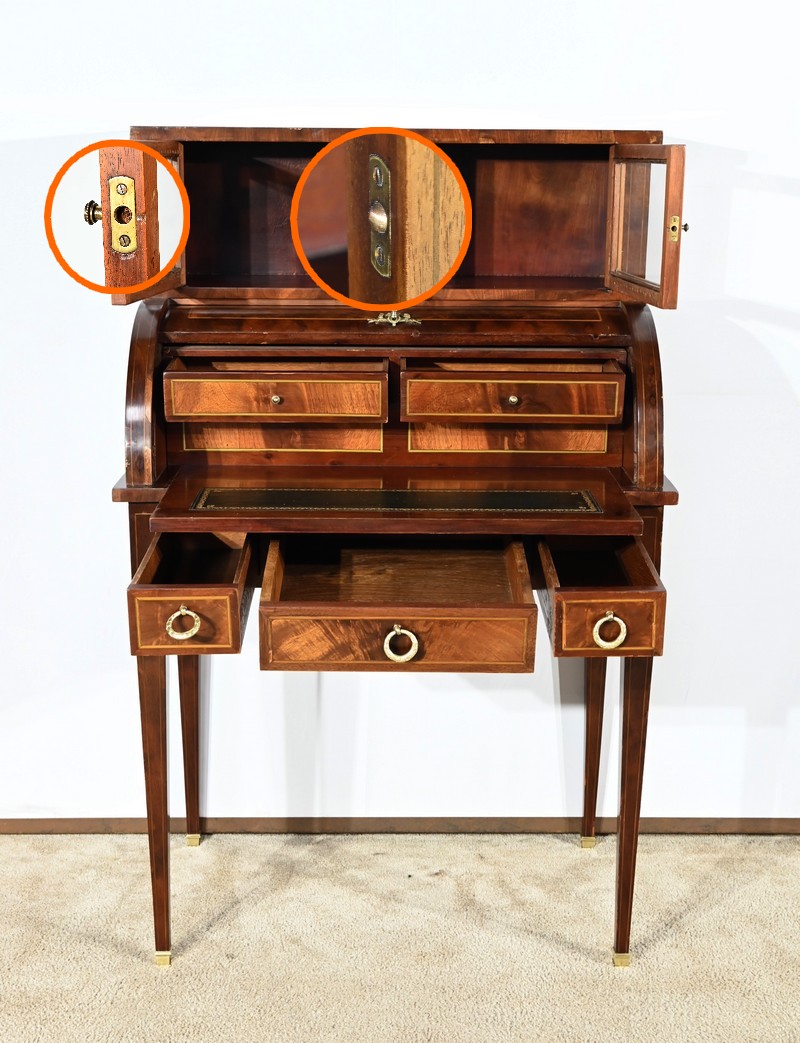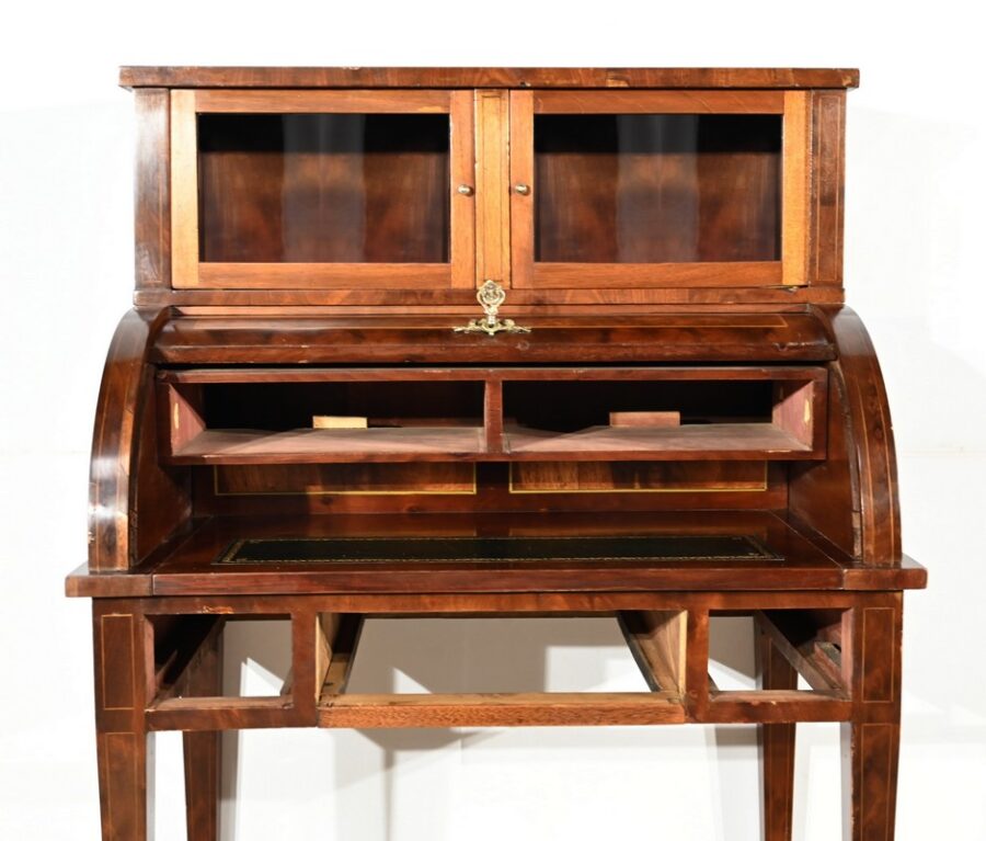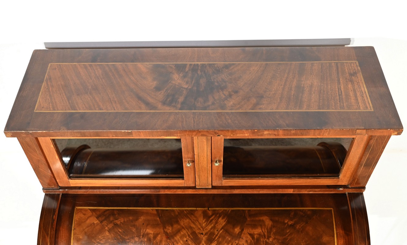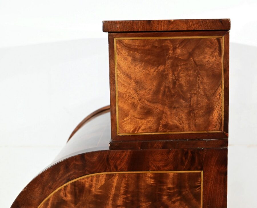 Le cylindre, foncé d’un panneau en ronce d’acajou souligné de filets de citronnier, est équipé d’une serrure fonctionnelle d’origine avec clé et entrée enrubannée en laiton.
