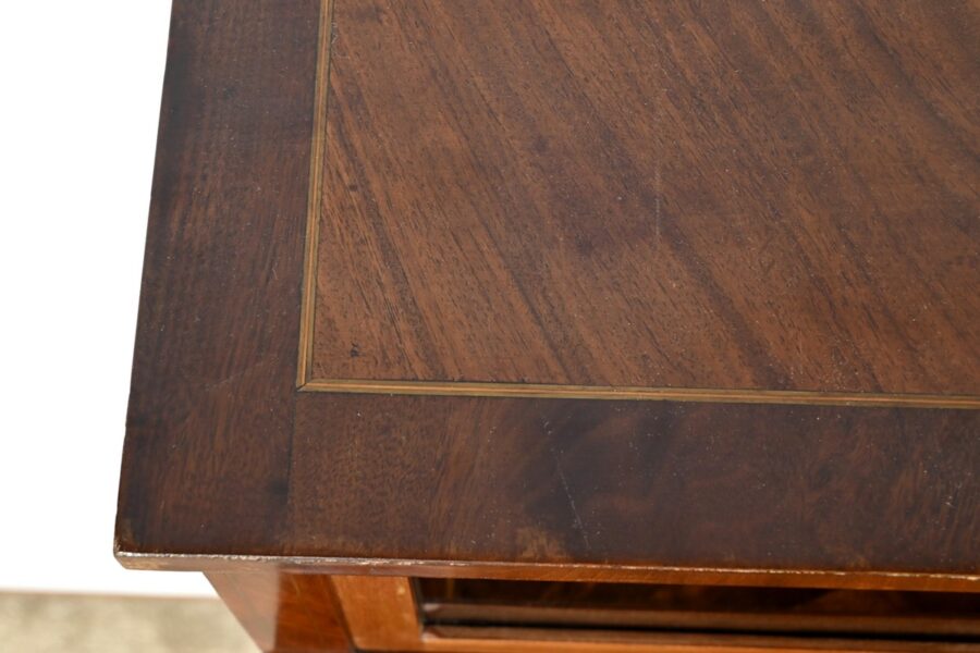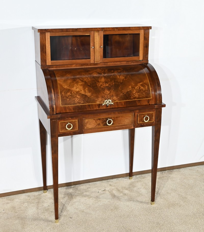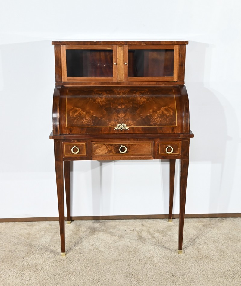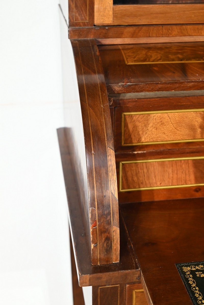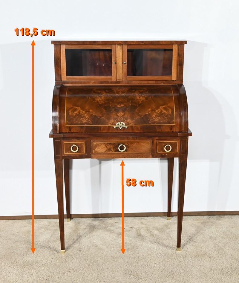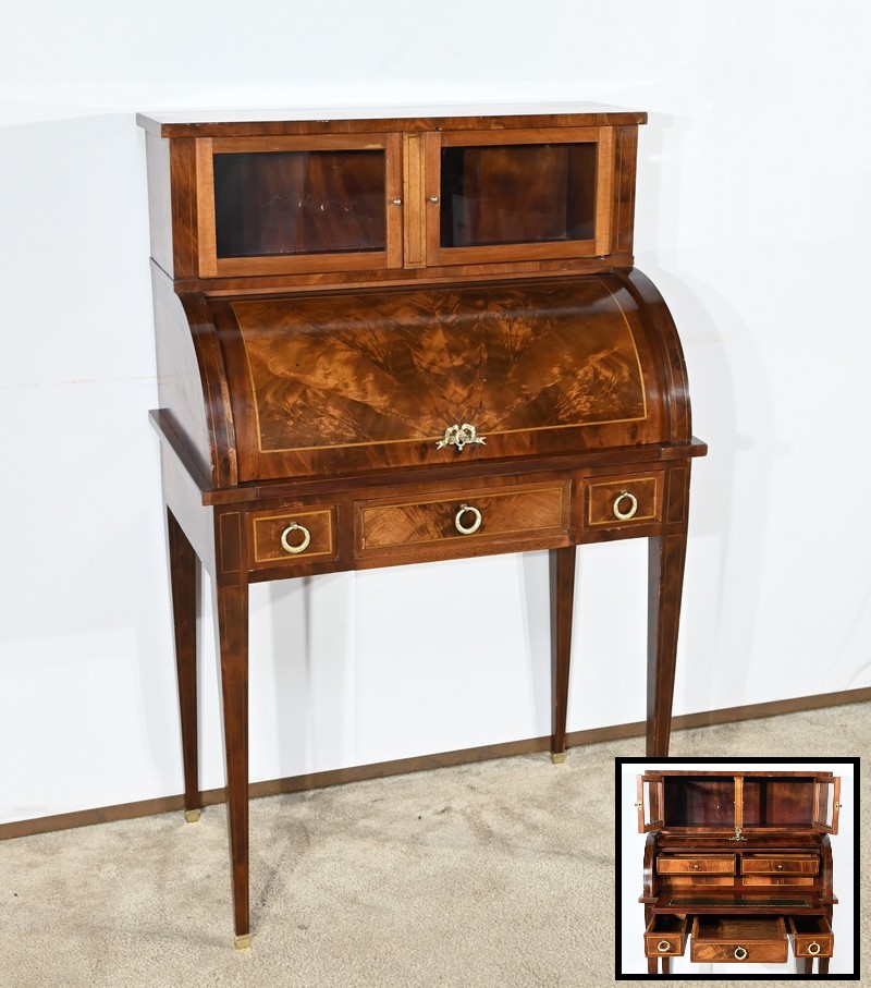 Le cylindre, foncé d’un panneau en ronce d’acajou souligné de filets de citronnier, est équipé d’une serrure fonctionnelle d’origine avec clé et entrée enrubannée en laiton.