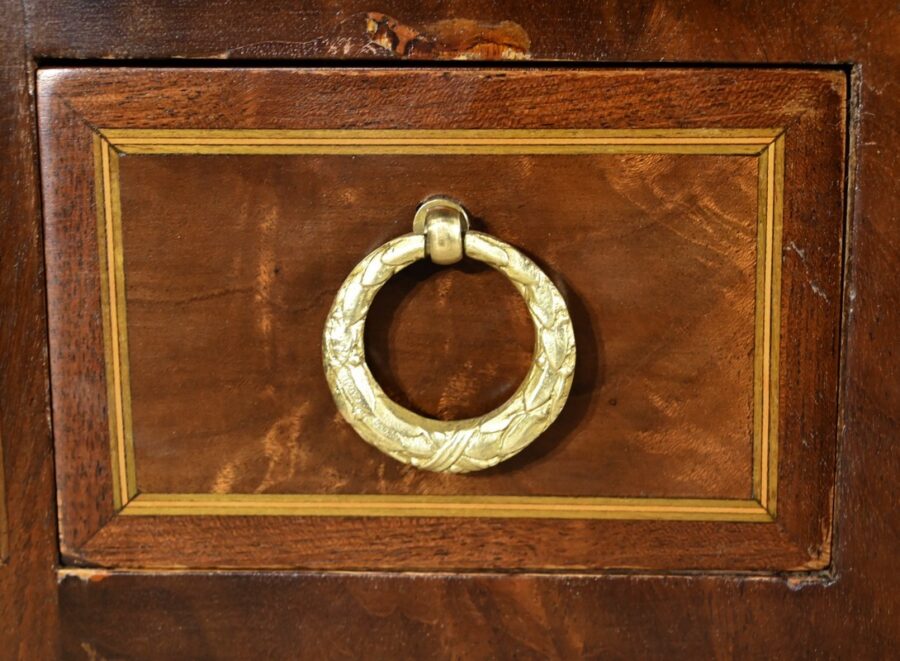 Ces derniers, en placage de ronce d’acajou avec filets de citronnier, sont agrémentés de poignées anneaux en bronze.