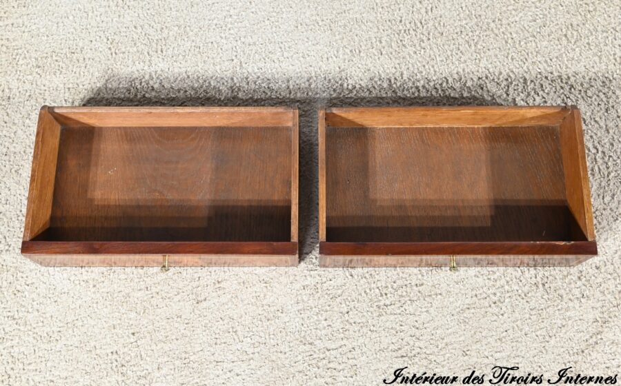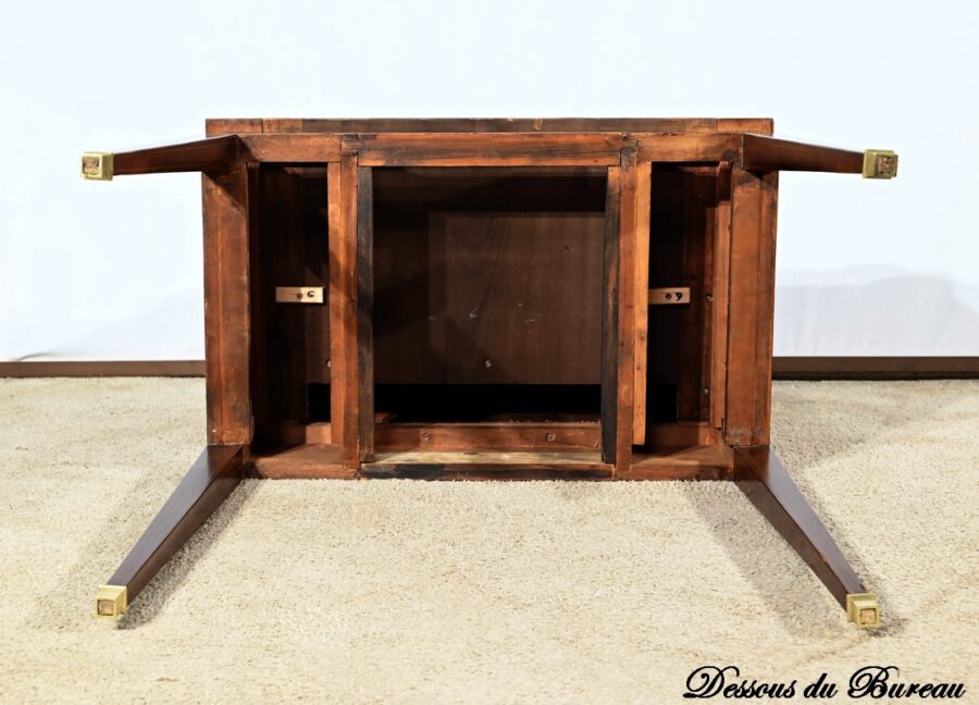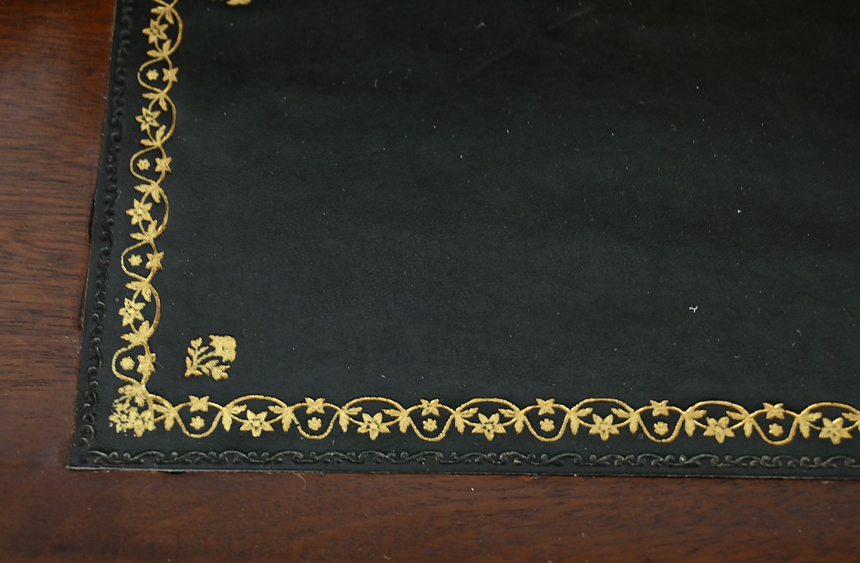 L’intérieur propose une tablette coulissante habillée d’un cuir vert postérieur avec vignettes dorées, à froid et motifs d’angle ainsi qu’une première série de deux tiroirs à bouton ciselé.