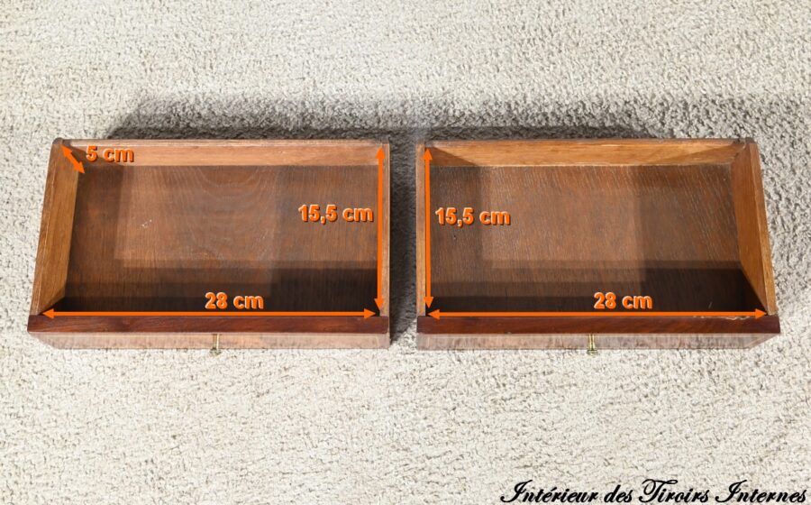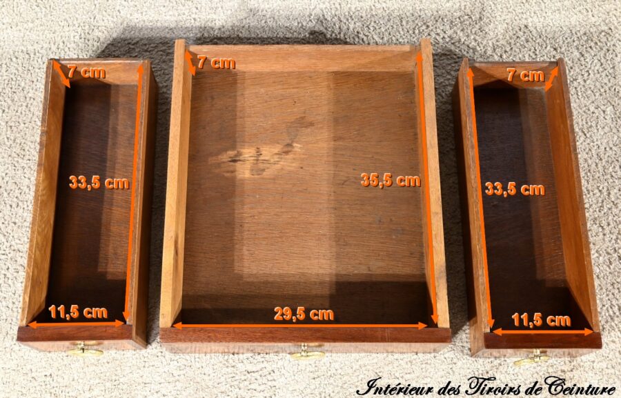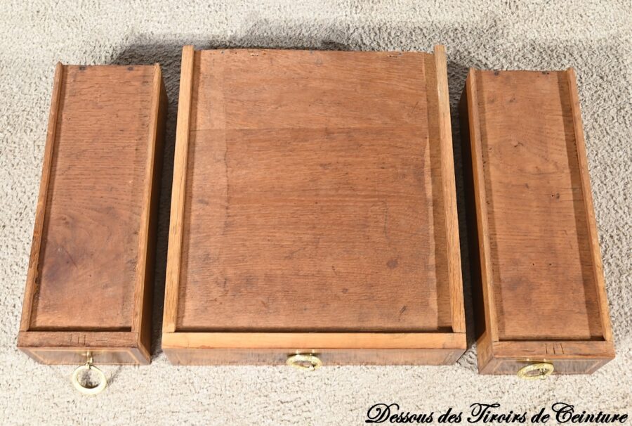 Ce meuble présente également en ceinture une seconde série de tiroirs, soit deux petits et un grand.
