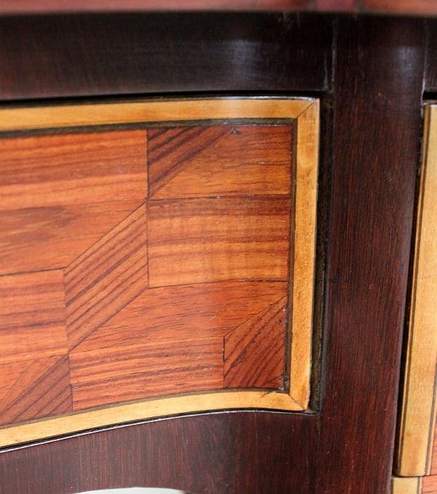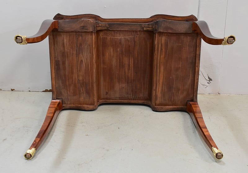 L’ensemble repose sur quatre pieds Sobrement Galbés, Marquetés sur l’intérieur, et terminés par des Sabots de Bronze.