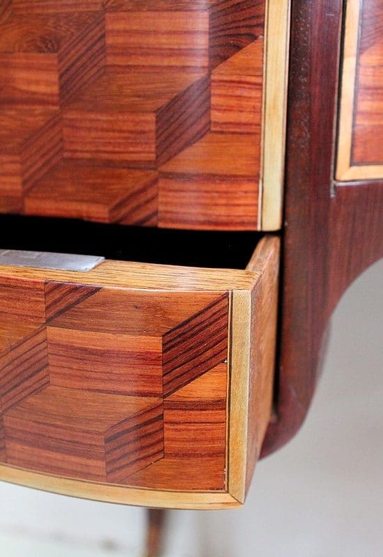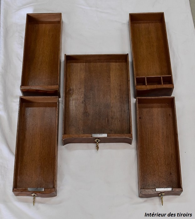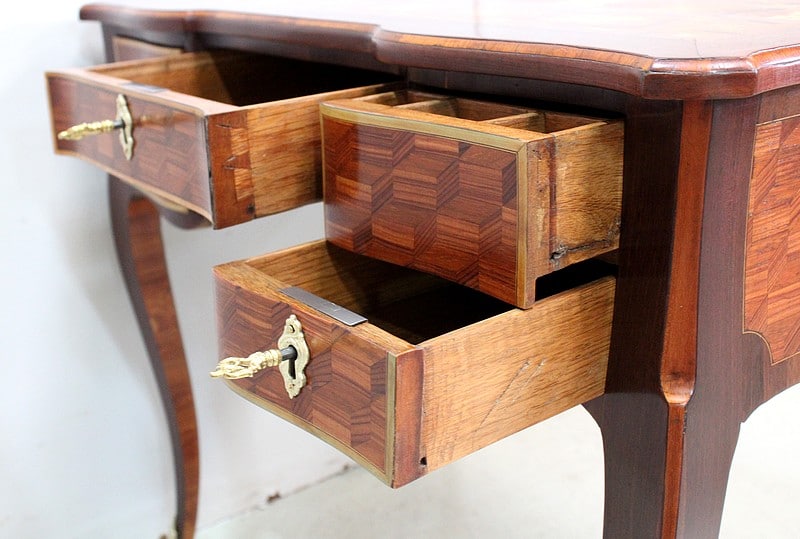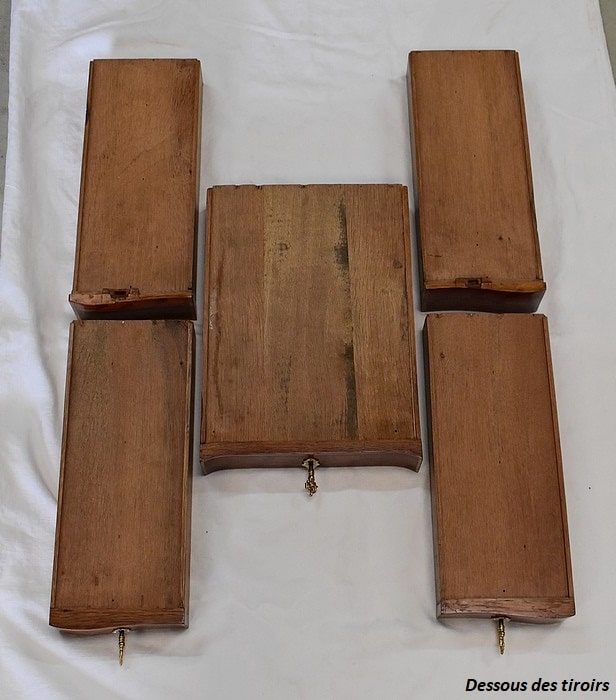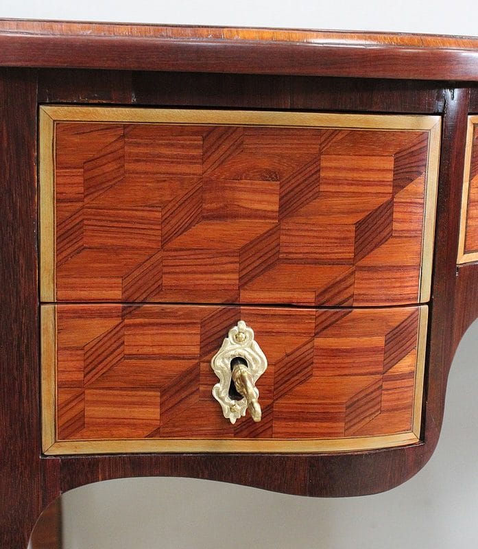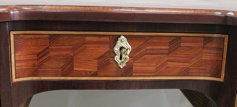 La ceinture Mouvementée de cette Table Bureau propose cinq tiroirs de profondeur identique, assemblés à Queues d’Arondes. Le premier, au centre, est plus large que les quatre autres, répartis par paire de part et d’autre. Les façades de ces tiroirs sont en Frisages Géométriques en Cubes. Ces Marqueteries, que l’on retrouve également sur les côtés du Meuble, sont soulignées par des filets de Bois teinté formant encadrements, et donnant l’illusion d’une composition à trois tiroirs seulement. Ces derniers sont pourvus d’entrées de serrures en Bronze et de verrous en état de fonctionnement, tous d’origine. Le Meuble est fourni avec ses trois clés, qui elles sont actuelles. A noter que le tiroir en haut à droite est partiellement compartimenté.