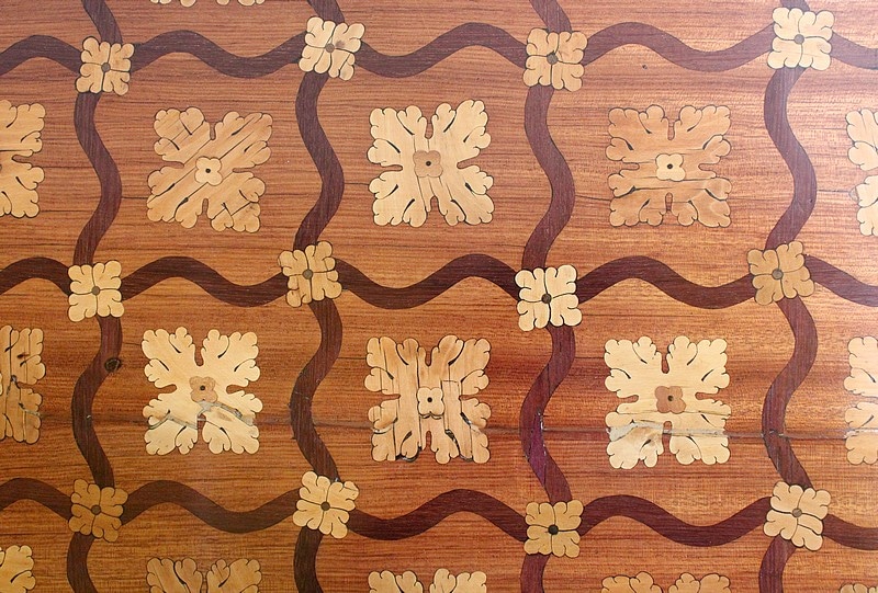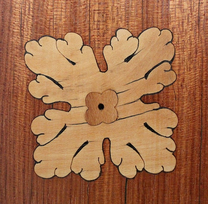 Le dessus est enjolivé d’un généreux Décor en Bois de Violette et Bois Clairs, et à motifs floraux. Le pourtour Chantourné de ce plateau est en Amarante.