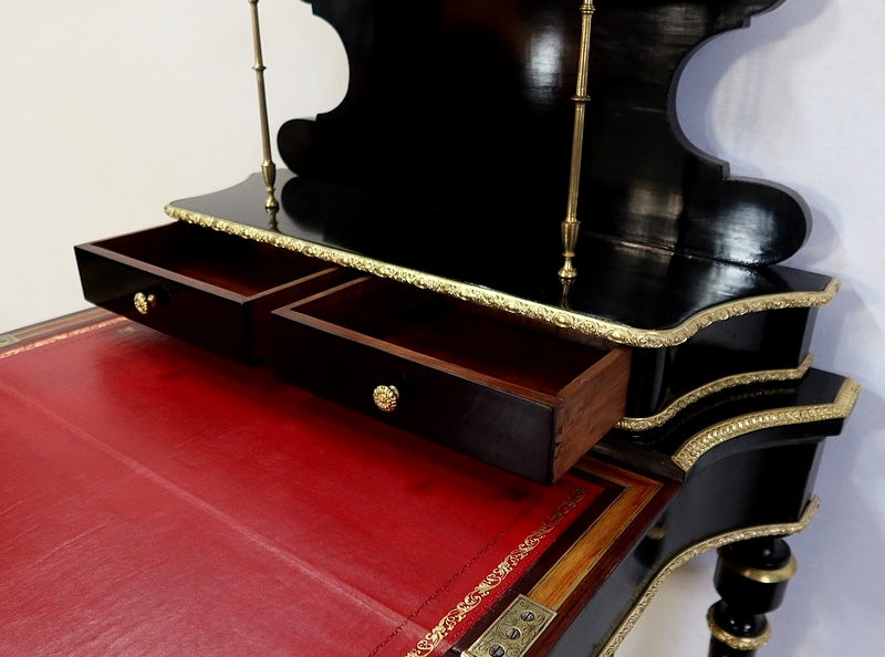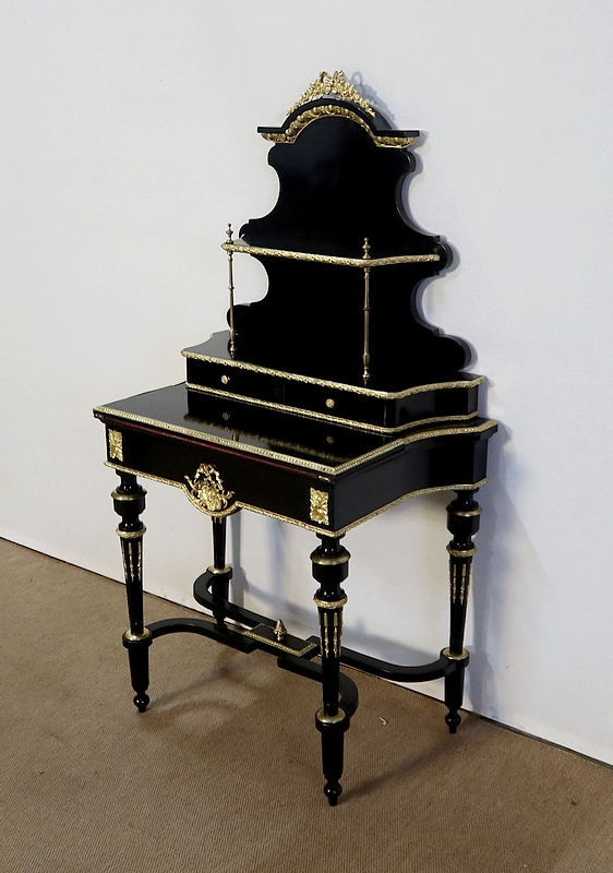 Bureau de Dame Napoléon III en poirier noirci, vernis tampon, ornementé de bronze et constitué de deux éléments.