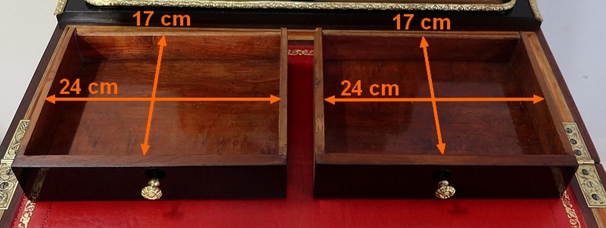 En partie intérieure, ce mobilier présente un cuir rouge actuel composé de vignettes à froid, vignettes dorées et motifs d’angles dorés. Le dessus repose, pour sa stabilité, sur un tiroir en ceinture doté d’une magnifique entrée en bronze enrubannée. La serrure et la clé sont d’origine et en parfait état de fonctionnement.