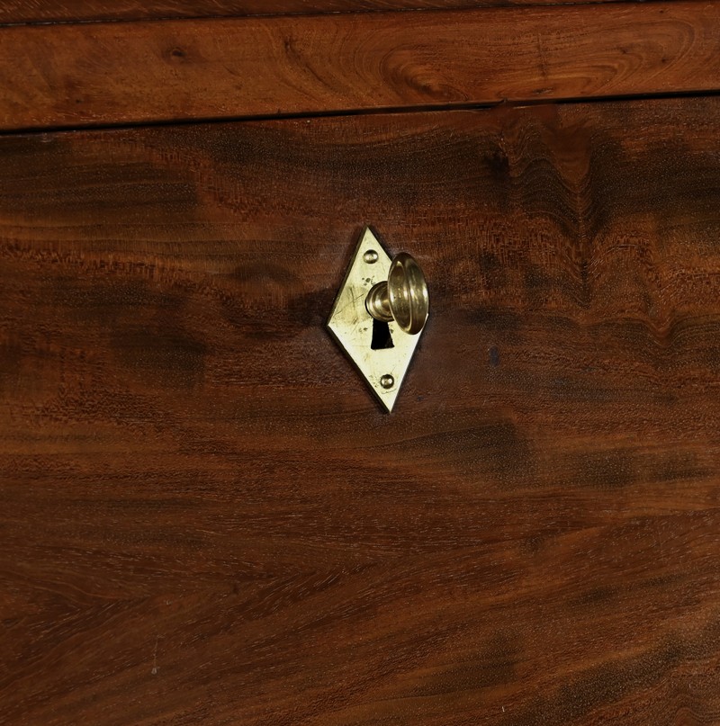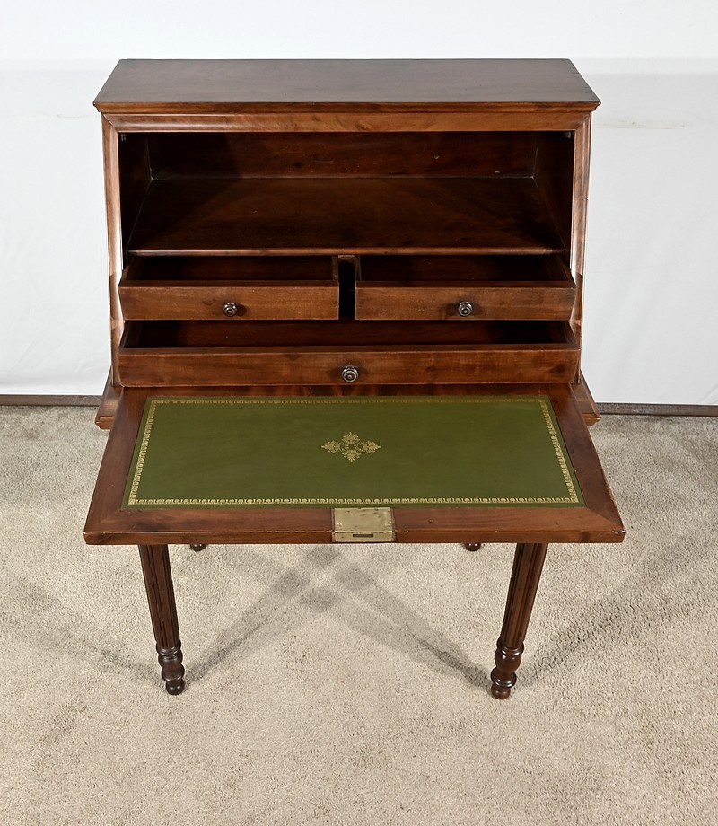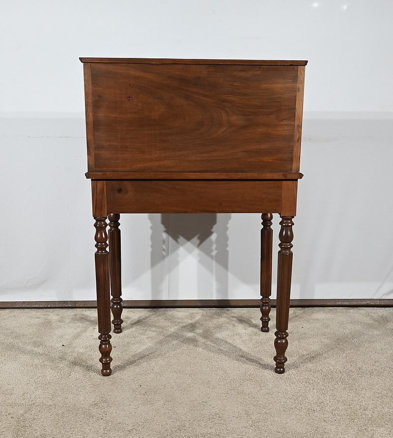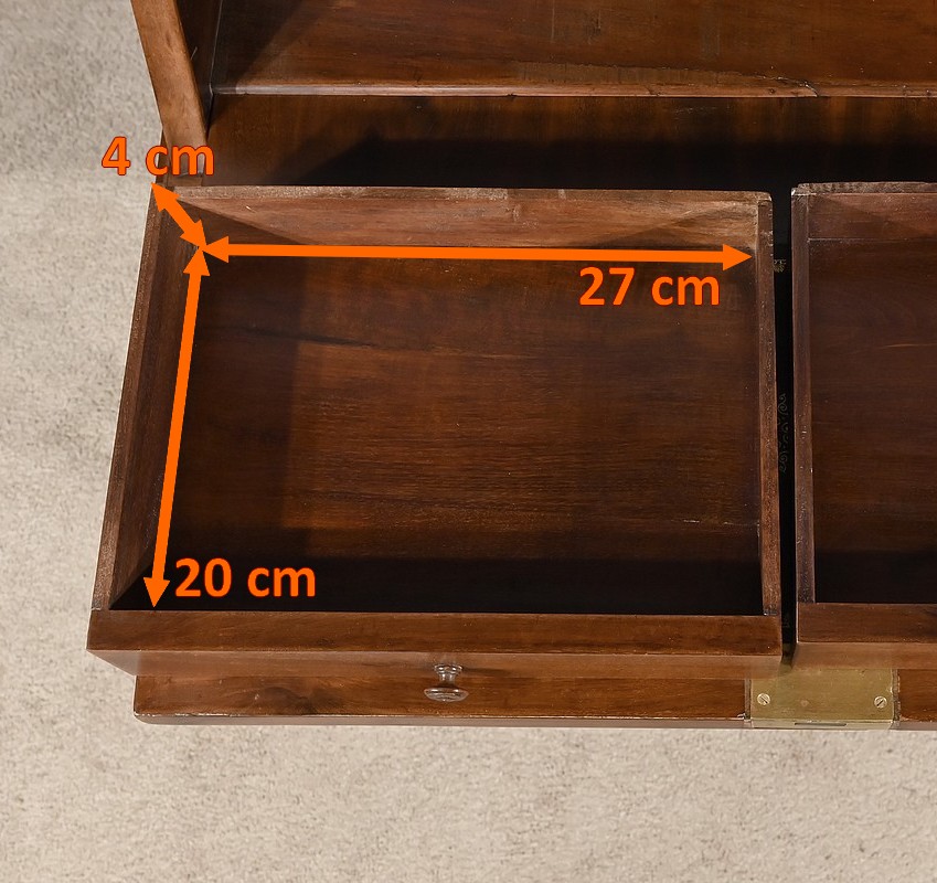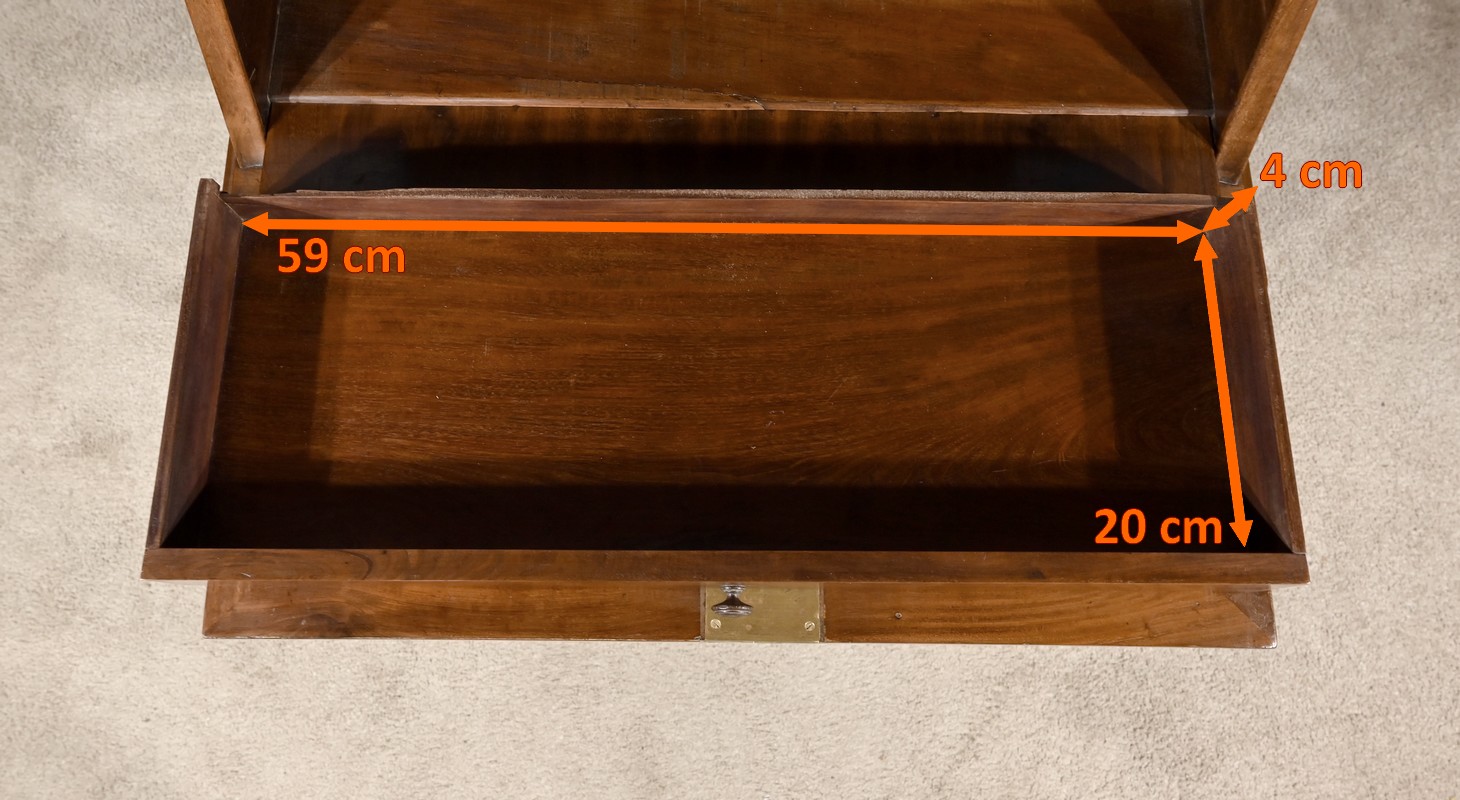 La partie supérieure en forme de trapèze est en retrait par rapport au dessous. Nous retrouvons un abattant reposant sur le plateau inférieur. La façade est sublimée par un acajou flammé d’une couleur nuancée. La serrure en laiton est accompagnée d’une entrée en applique prenant la forme d’un losange. A l’intérieur, l’abattant est garni d’un cuir vert avec motif central, vignette dorée et vignette à froid. Nous observons un grand tiroir en partie basse, deux plus petits au dessus et un espace de rangement.
