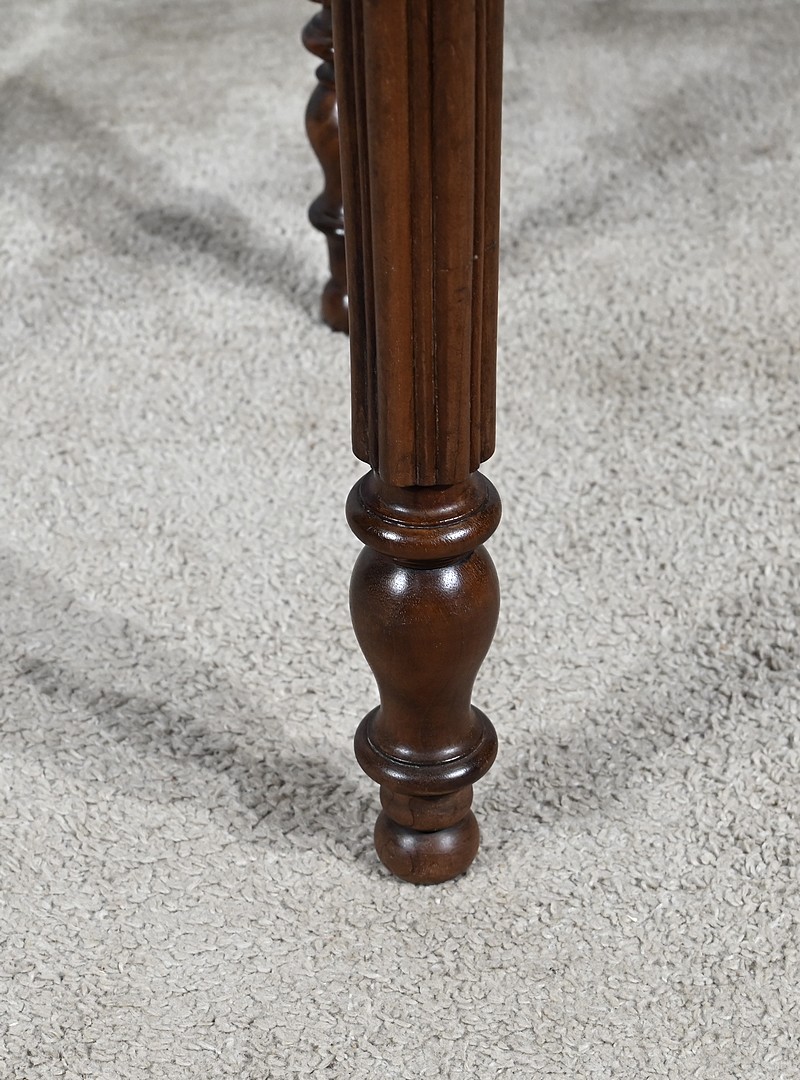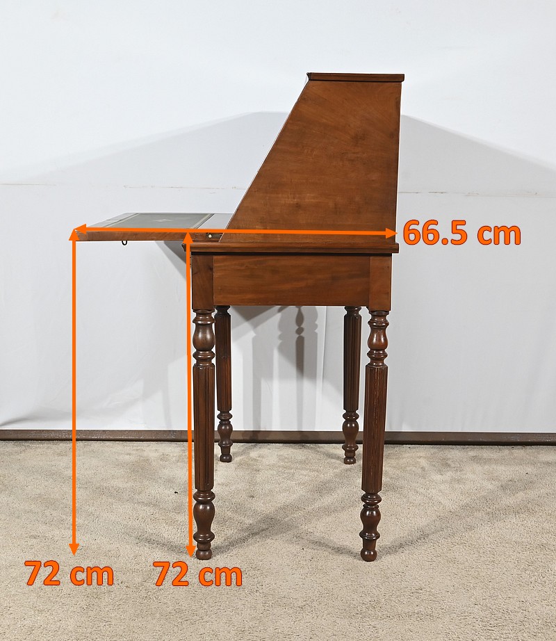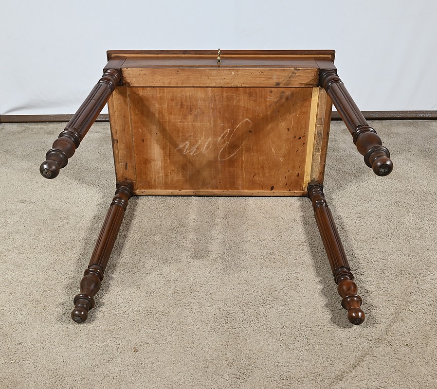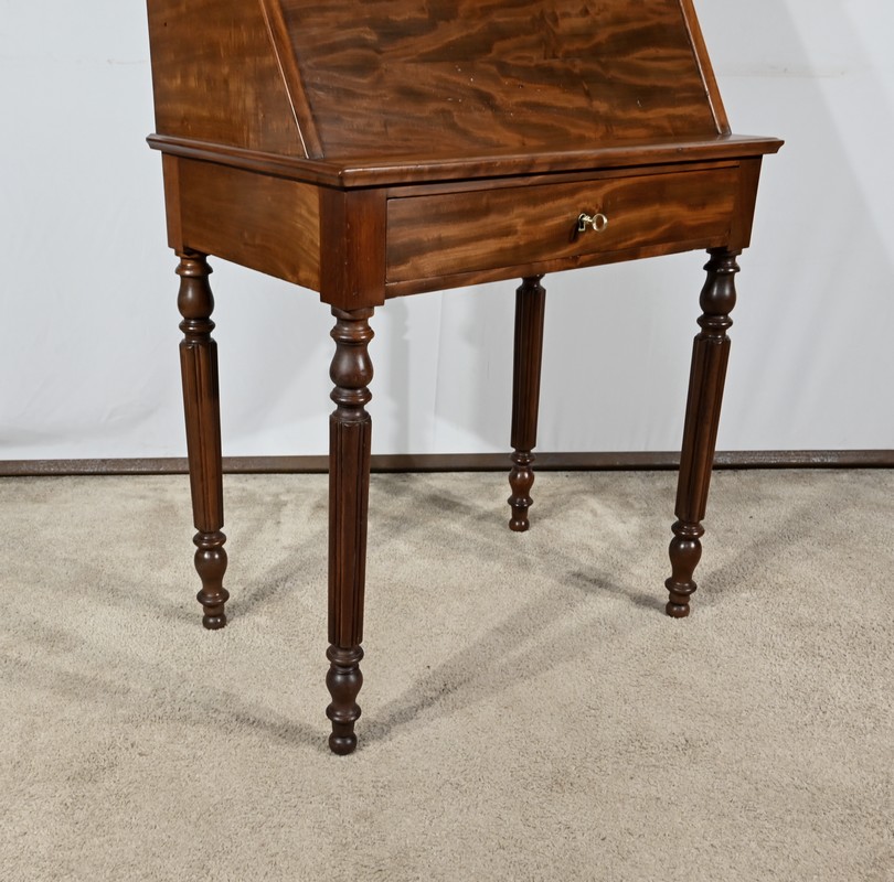 Ce bureau de pente en acajou massif et placage d’acajou comprend une partie basse ouvrant par un tiroir en ceinture. Ce tiroir est doté d’une clé et d’une serrure d’origine en état de fonctionnement. Ce meuble toutes faces repose sur quatre pieds tournés à godrons.