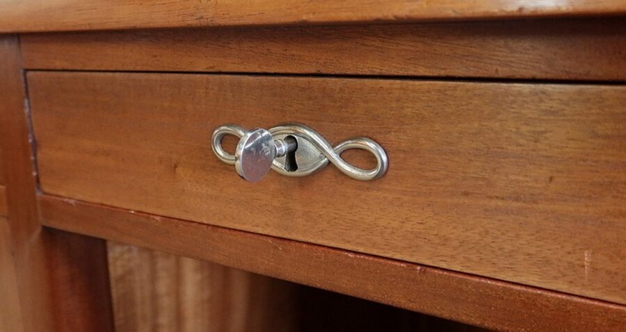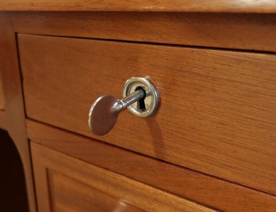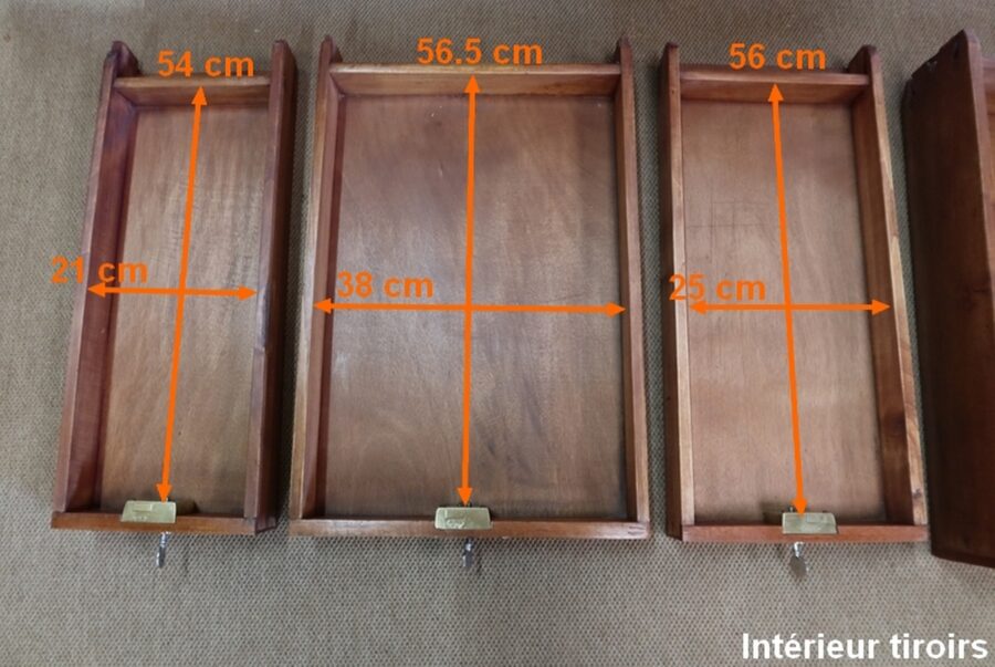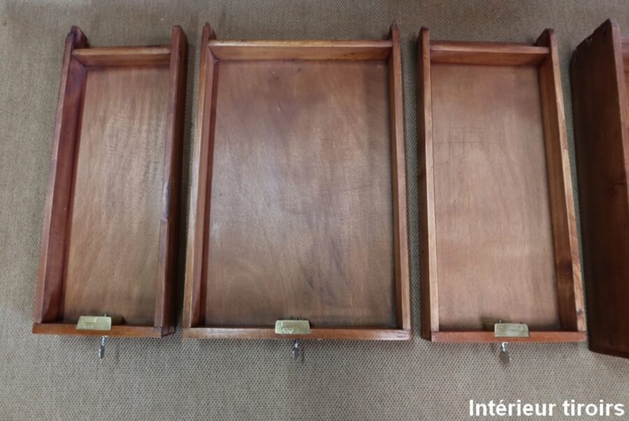 Ce bureau plat cloisonné présente en ceinture trois tiroirs se fermant à clé. Celui du milieu, plus grand, est doté d’une belle entrée enrubannée. Chacune des serrures et clés de ce mobilier sont en parfait état de fonctionnement.