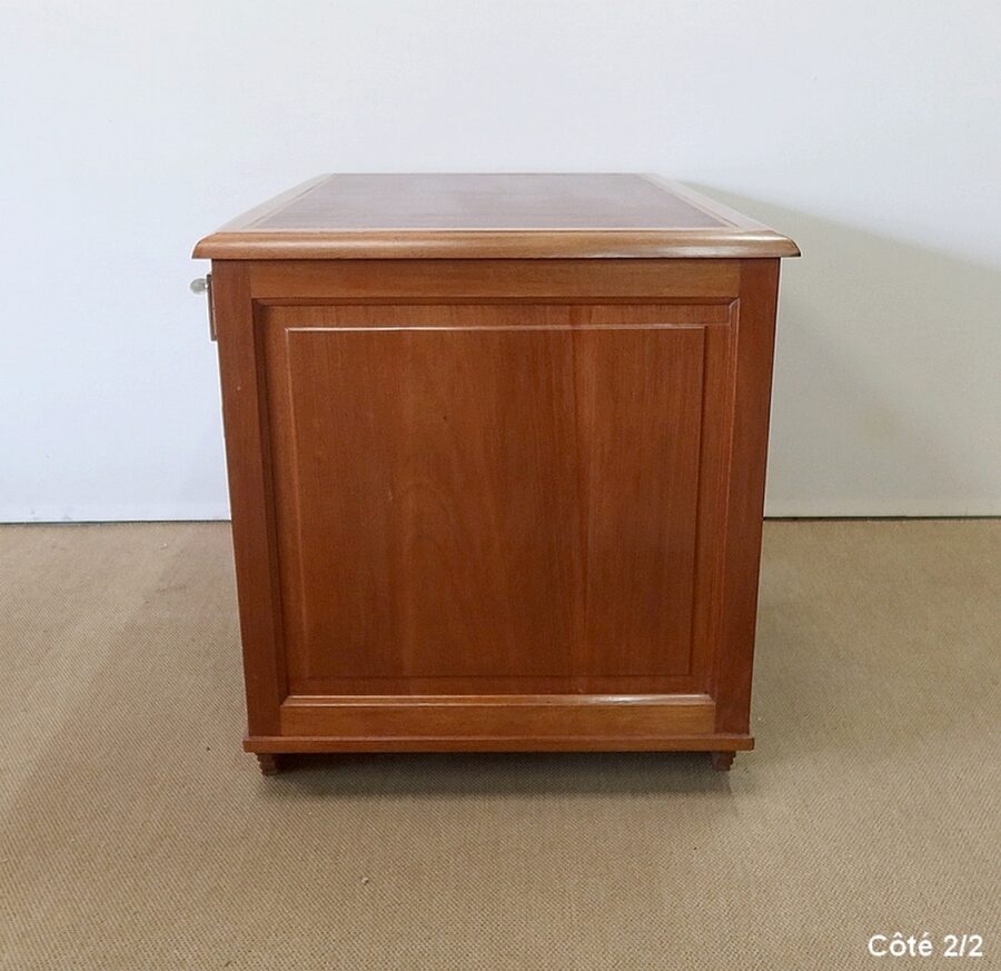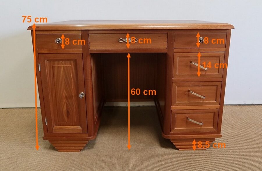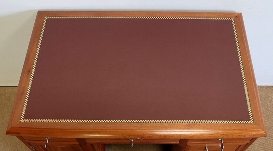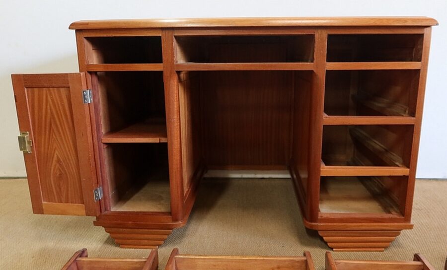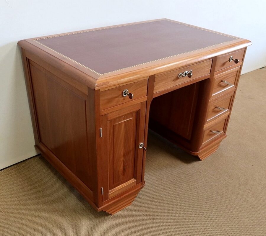 Bureau de milieu en acajou massif recouvert d’un magnifique cuir, ouvrant par 6 tiroirs et une porte, et reposant sur un piétement Art déco.