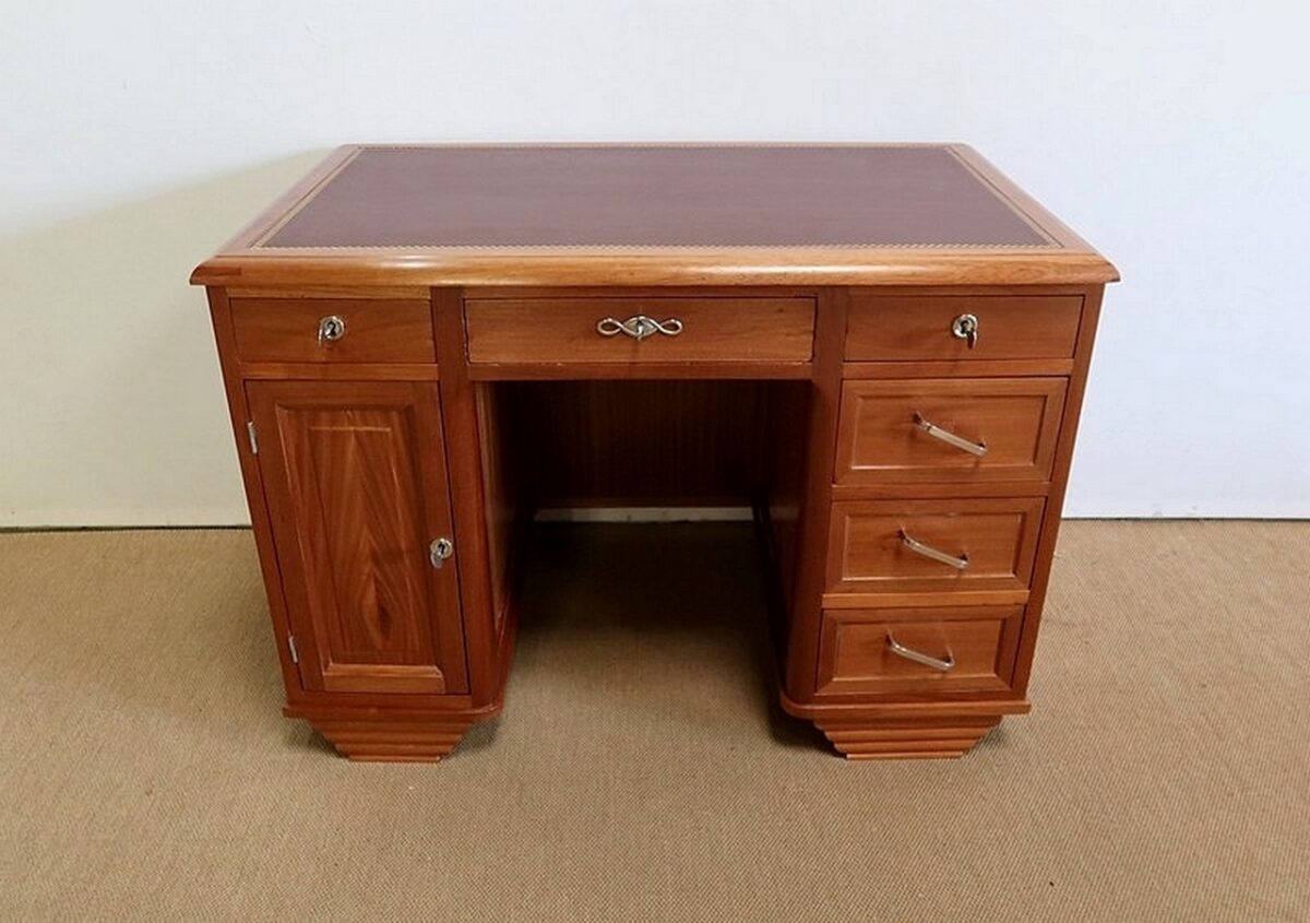 Bureau de milieu en acajou massif recouvert d’un magnifique cuir, ouvrant par 6 tiroirs et une porte, et reposant sur un piétement Art déco.