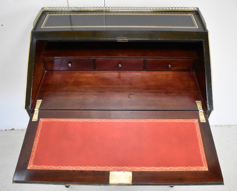Ce Mobilier découvre un intérieur en Palissandre, avec au fond trois petits Tiroirs bloqués par une butée, surmontés d’une Niche prenant toute la Largeur. La Tablette présente un Élégant Cuir Rouge avec Vignettes Dorées.