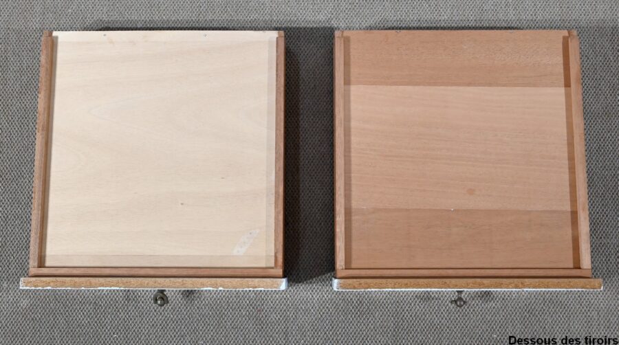Il présente un plateau, en placage d’acajou, et ouvre par deux tiroirs identiques munis de poignées de tirage en fer.