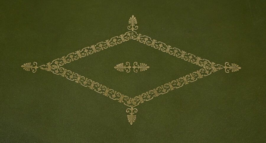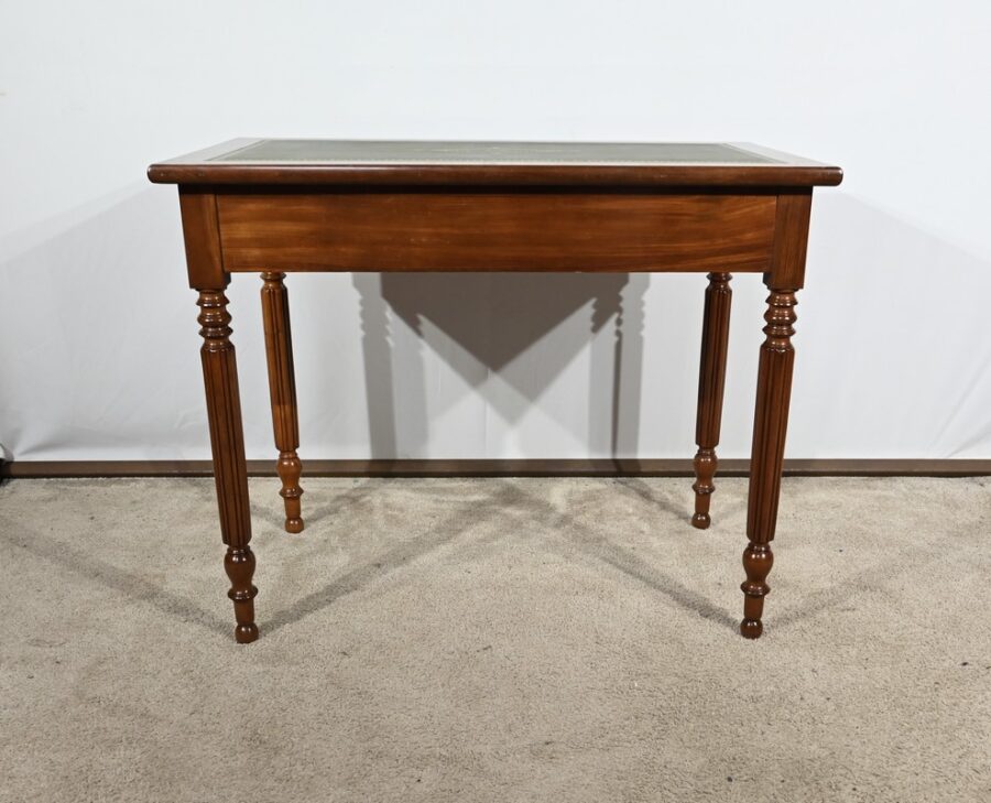 Bureau plat Louis-Philippe en acajou massif et placage d’acajou garni d’un cuir remplacé, avec vignette dorée, vignette à froid et motif central. Ce dernier est entouré d’un cadre à coupe d’onglet. Ce mobilier est muni d’un tiroir en ceinture avec sa clé et sa serrure d’origine en état de fonctionnement. L’ensemble repose des pieds tournés à godrons.