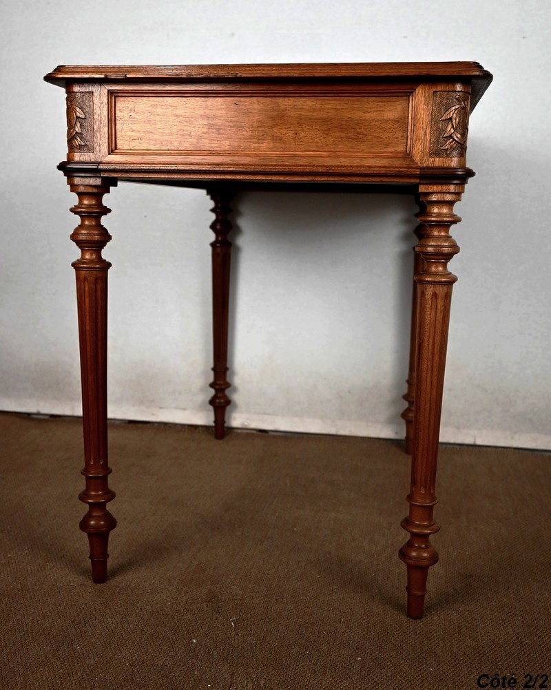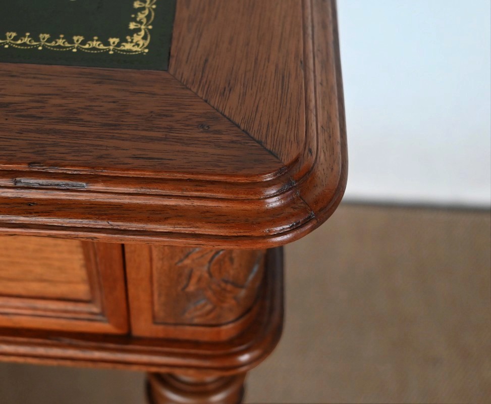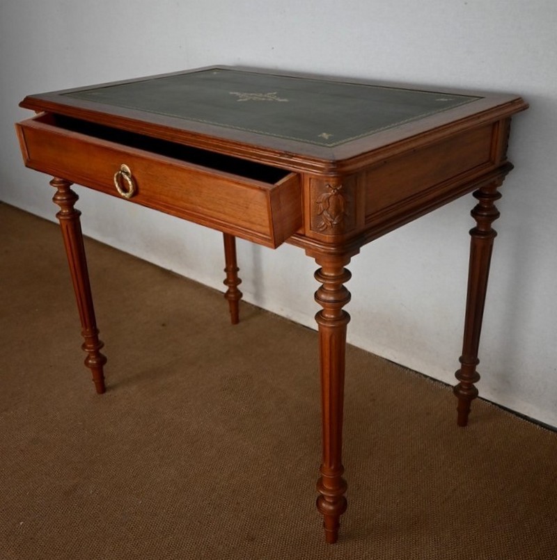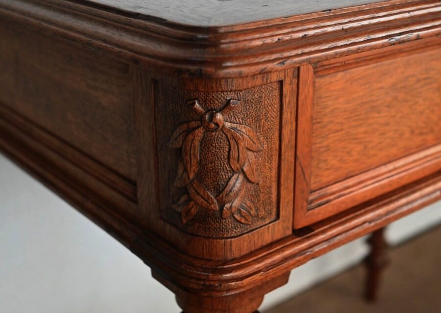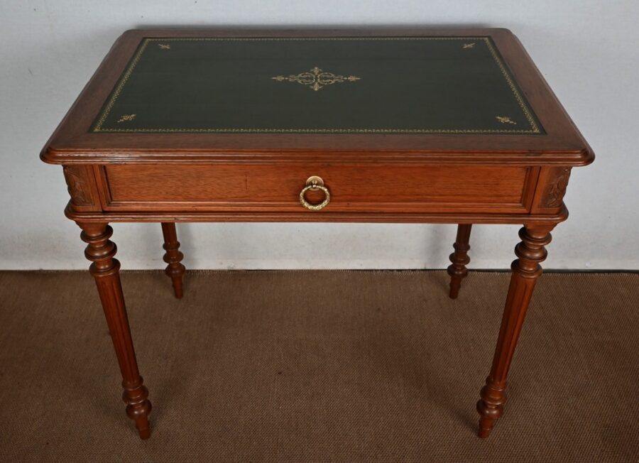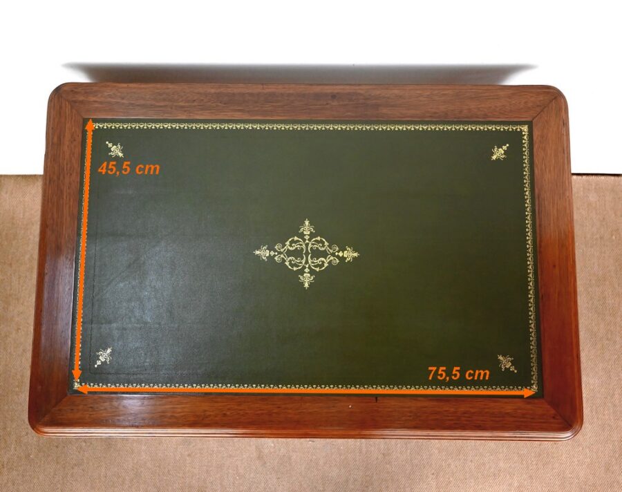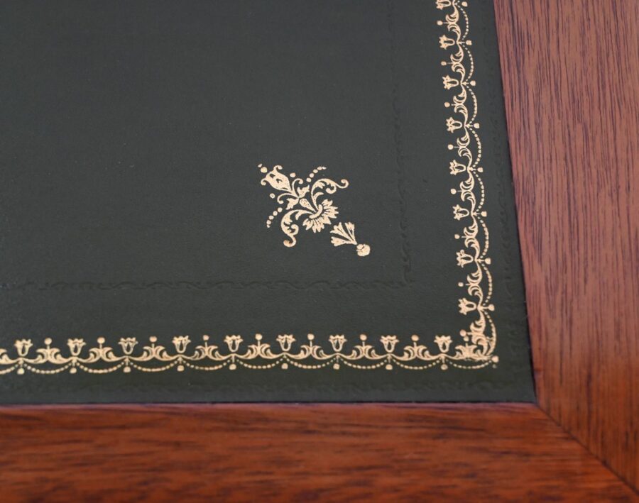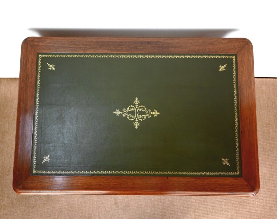 Petit bureau de milieu, en acajou massif, au dessus à encadrement à coupe d’onglet dont l’arête est moulurée en gorges et en doucines. Le centre est foncé d’un cuir vert amande orné d’une vignette à froid et dorée, et de motifs d’angles et central.