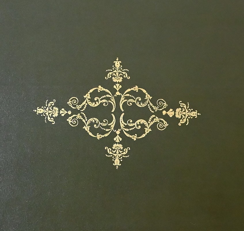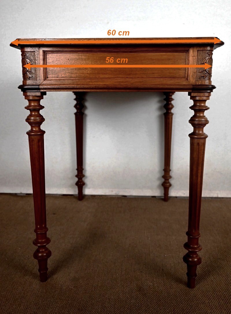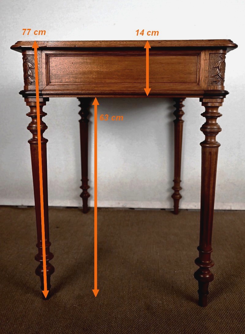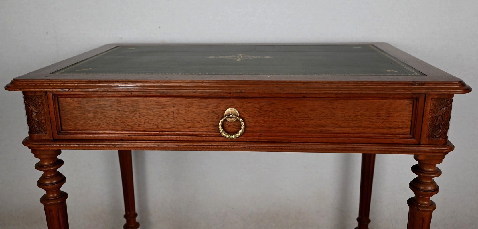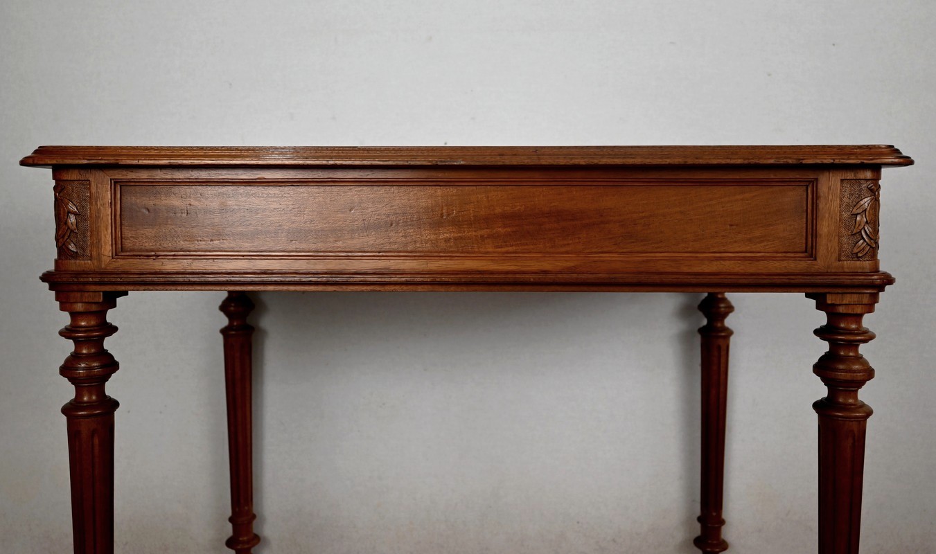 Petit bureau de milieu, en acajou massif, au dessus à encadrement à coupe d’onglet dont l’arête est moulurée en gorges et en doucines. Le centre est foncé d’un cuir vert amande orné d’une vignette à froid et dorée, et de motifs d’angles et central.