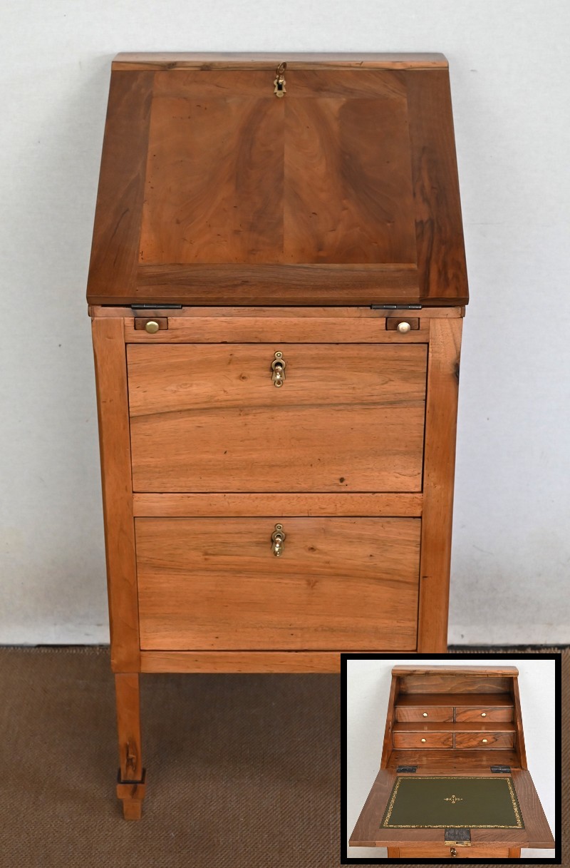 La partie haute inclinée présente un abattant, à encadrement avec panneau central dédoublé, munis d’une serrure fonctionnelle avec entrée et clé. Ouvert, il repose sur deux tirettes, apportant plus de stabilité et de robustesse.