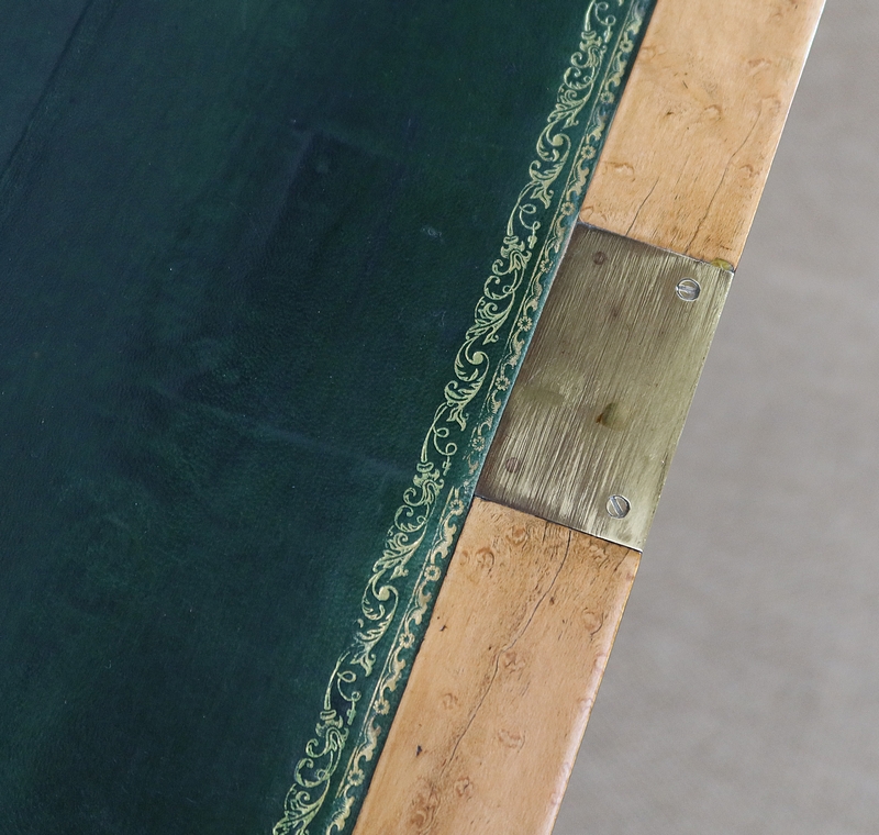 Ce bureau exceptionnel est doté d’un dessus réalisé dans le même esprit que l’abattant et repose sur quatre pieds en érable moucheté massif décoré d’une feuille d’acanthe finement sculptée en partie haute. Cette décoration est agrémentée au centre d’une partie plate en amarante, que l’on retrouve également sur le devant du pied. De chaque côté, nous notons la présence d’une gorge faite dans le bois.
