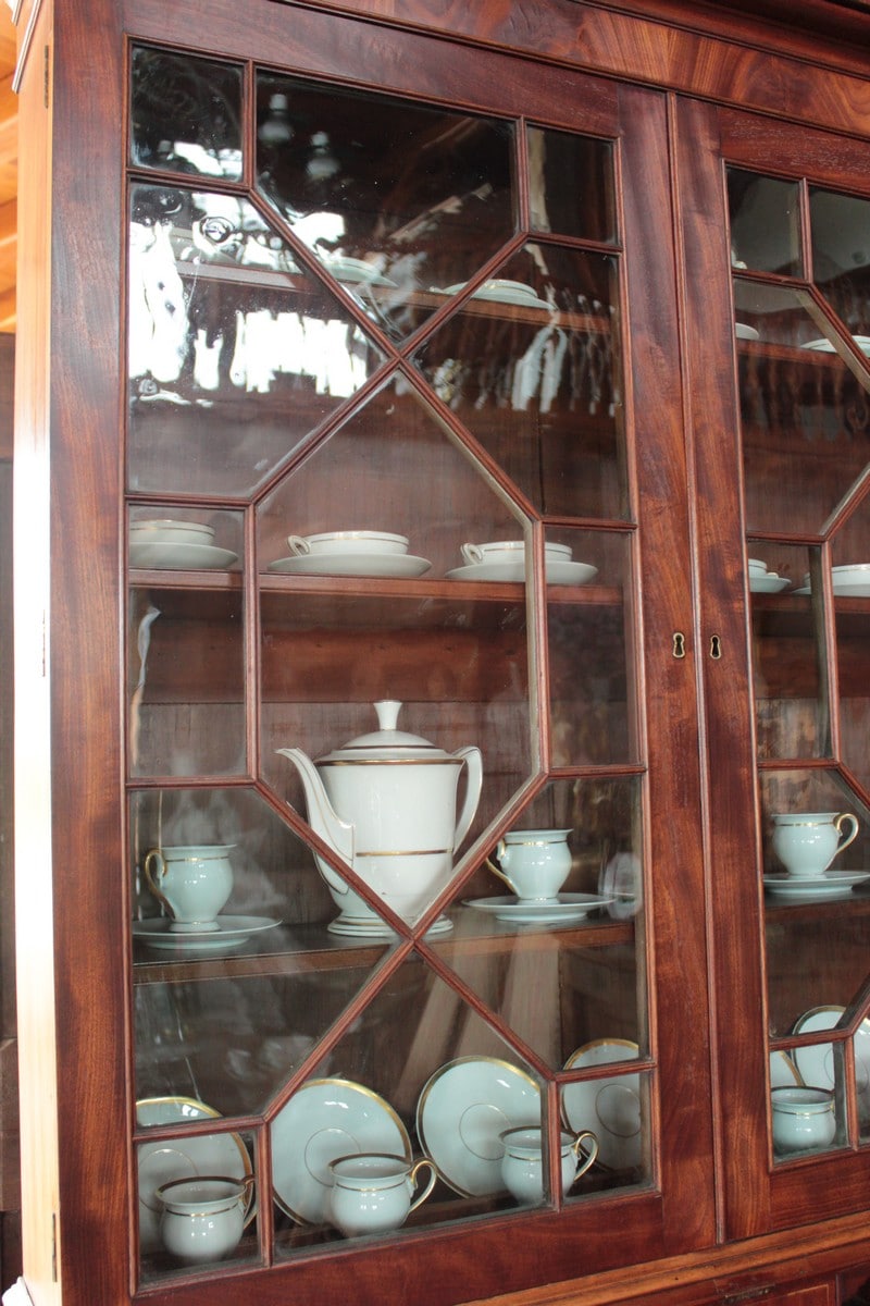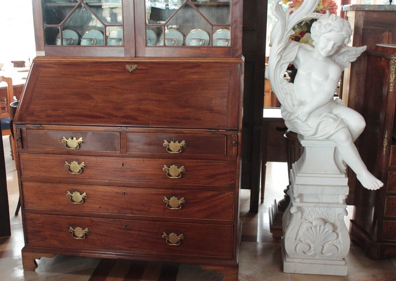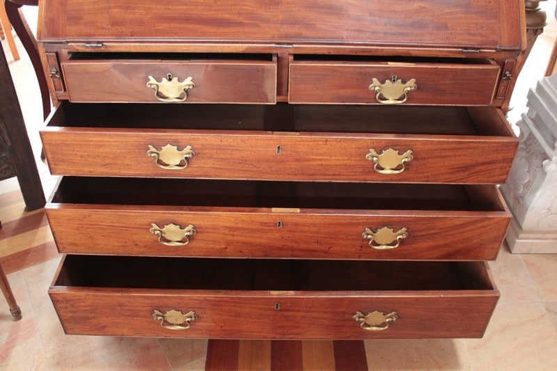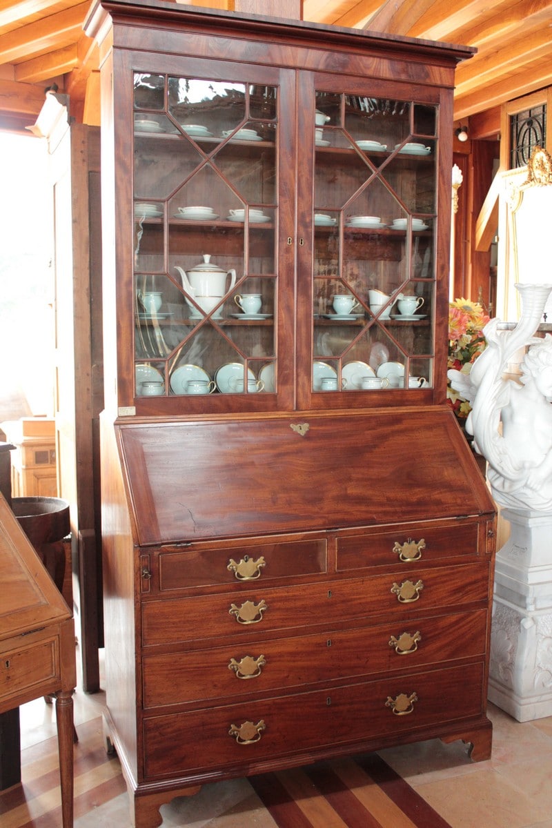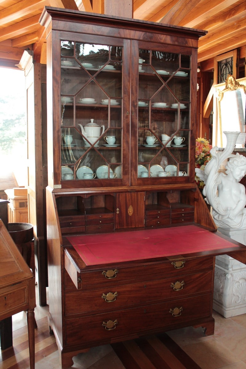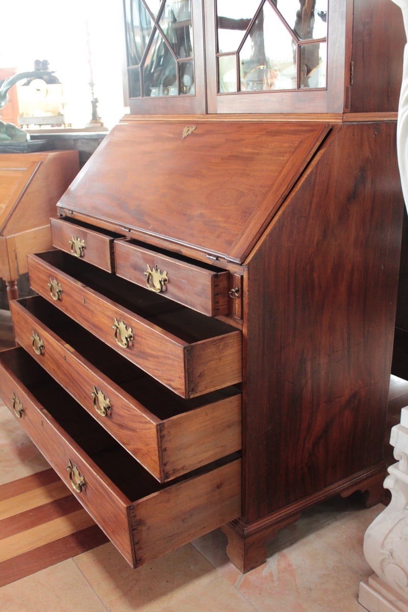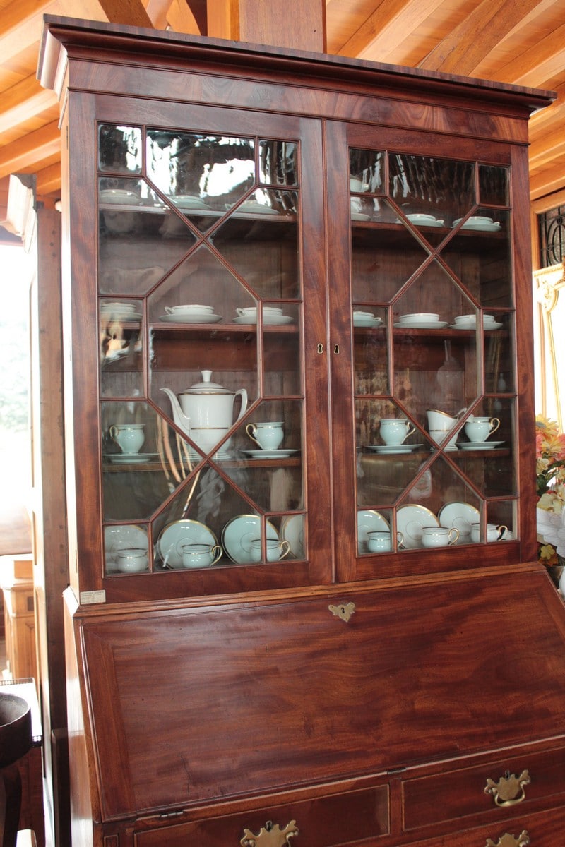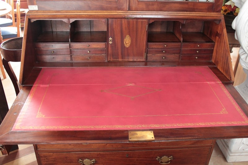 Scriban-Bibliothèque anglais en acajou d’époque Georgienne. La partie haute ouvre par 2 portes vitrées à léger barreautage , la partie écritoire ouvre par un abattant recouvert d’un cuir rouge (changé) et la partie basse par 5 tiroirs sur 4 rangs, en ordre croissant (du + petit en haut au + profond en bas) et garnis de poignées de laiton. L’abattant, ouvert, repose sur 2 tirettes et laisse apparaître une petite porte au milieu et, de chaque côté, 2 casiers et 6 petits tiroirs.