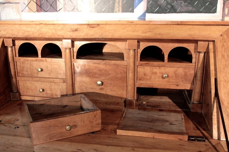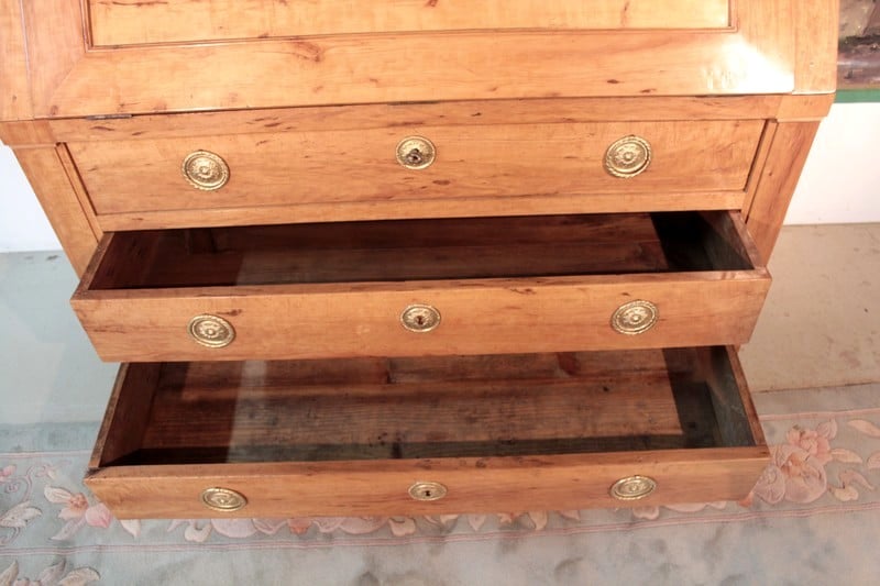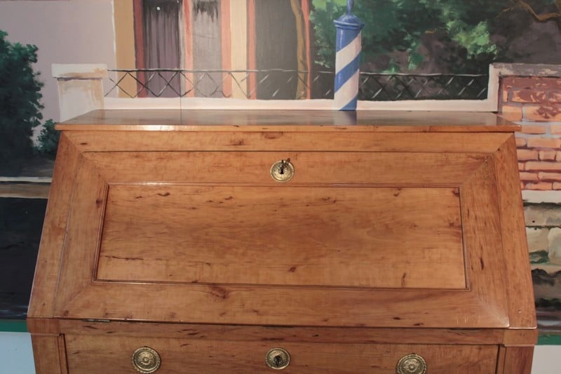 Commode Scriban en poirier dans le goût Directoire ouvrant par 1 abattant et 3 tiroirs à traverse apparente. L’abattant découvre 4 petits tiroirs et 1 grand, fermant par système secret, surmontés de niches au bandeau cintré. Une niche secrète se cache sous le plus grand tiroir. Les entrées de serrure et les anneaux de tirage sont en laiton. Travail provincial de la première moitié du XIXe