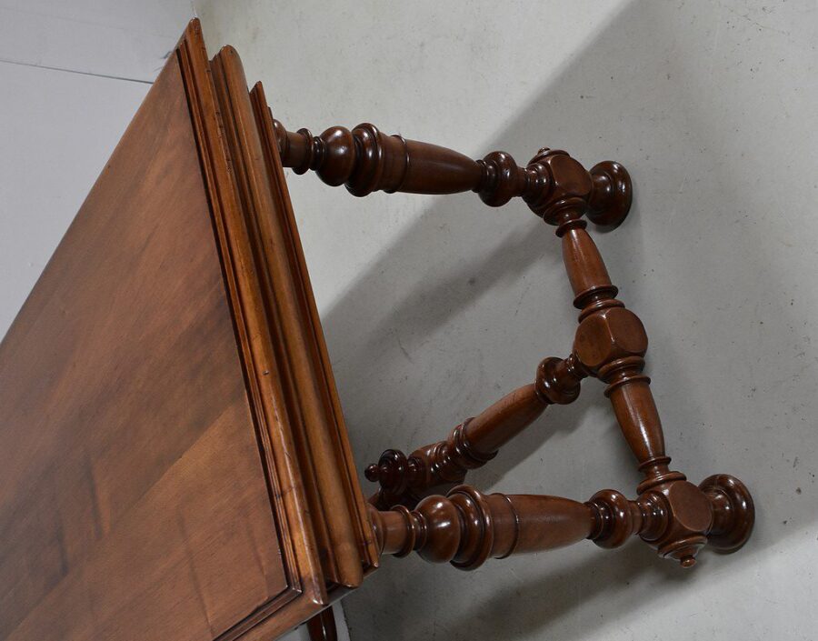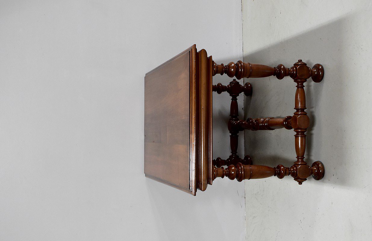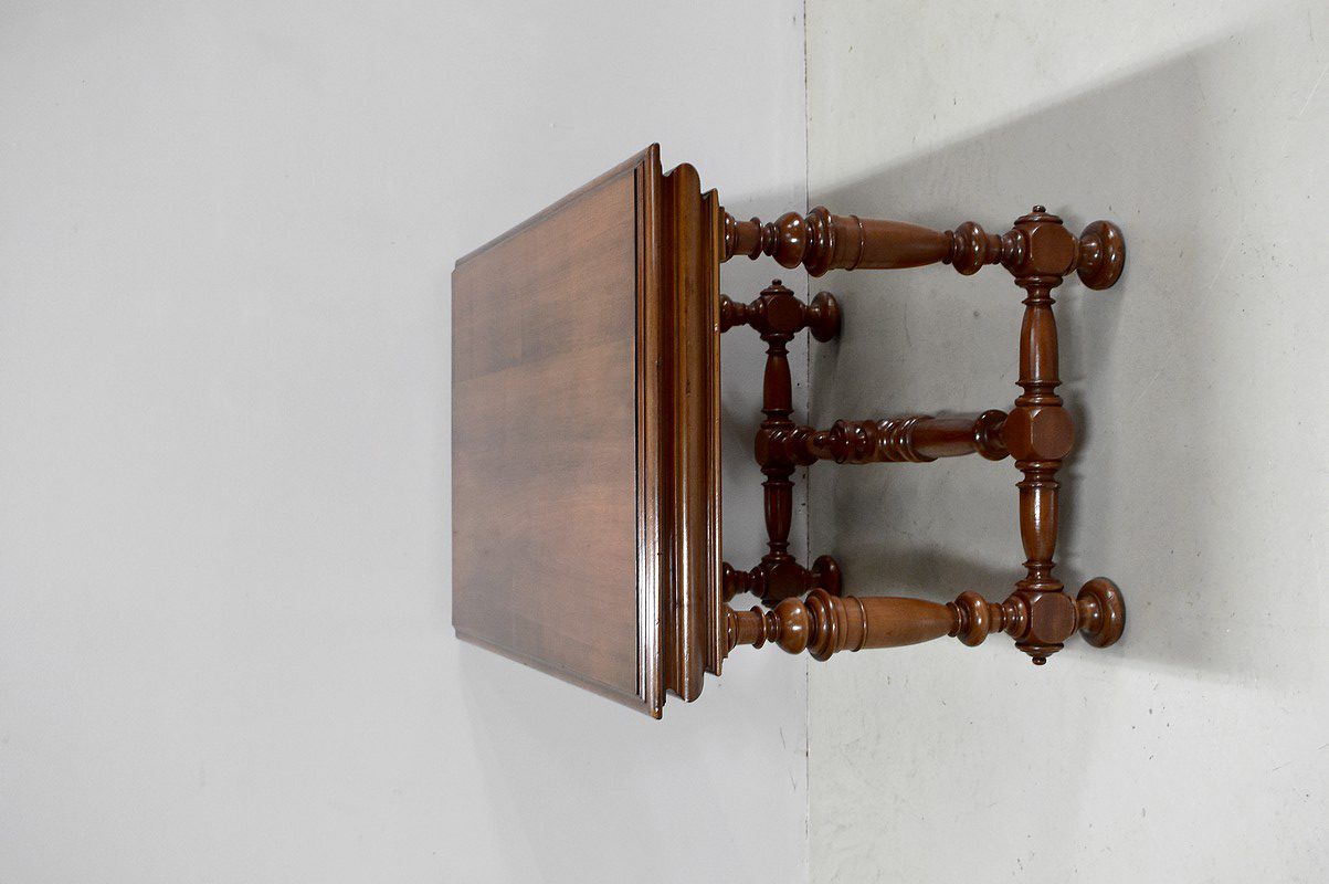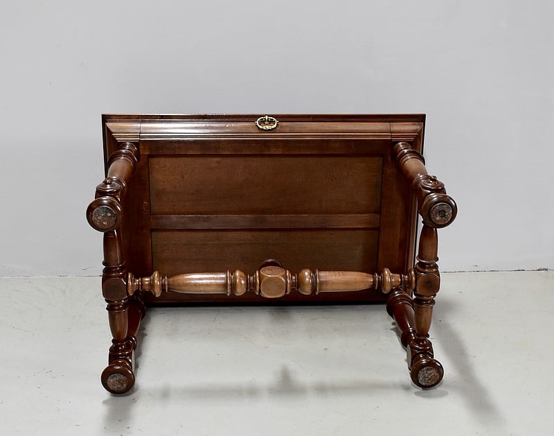 Elle repose sur 4 pieds tournés à entretoise en bois tourné et orné d’une sculpture en son centre.