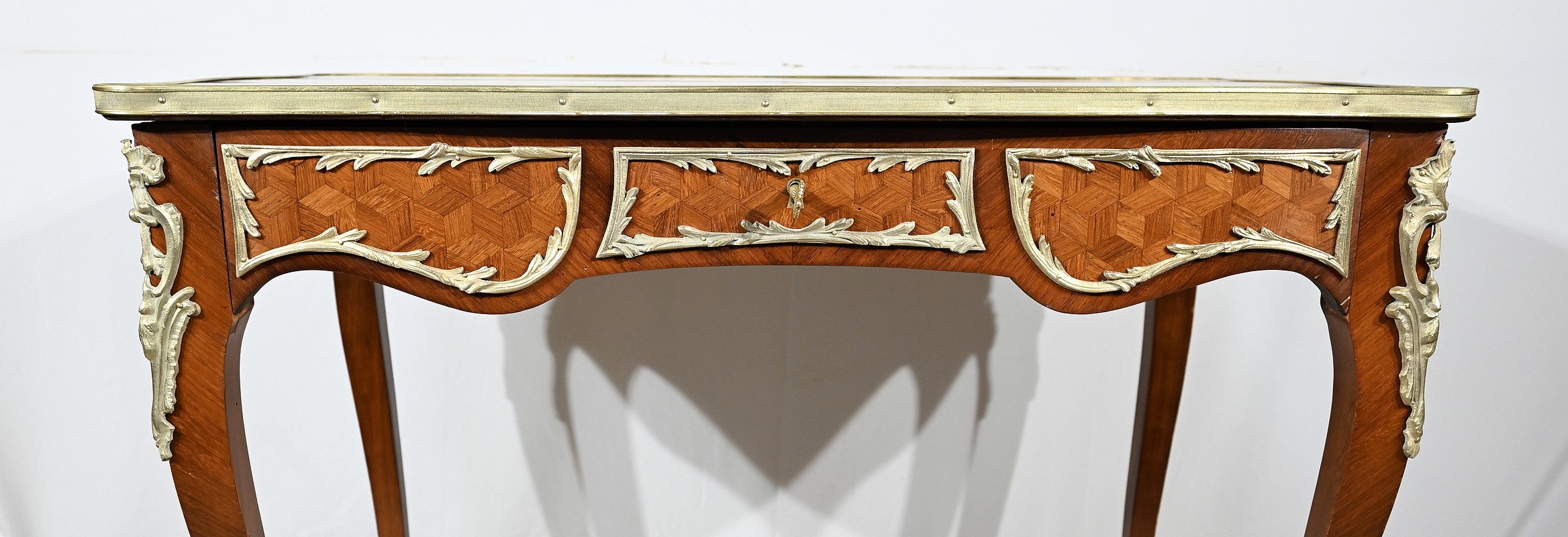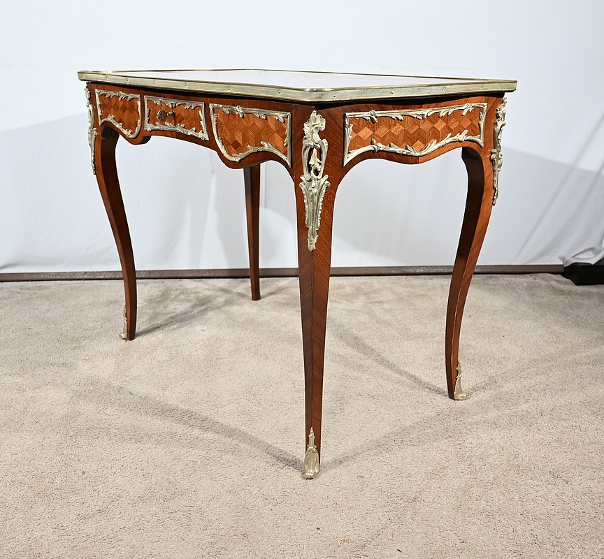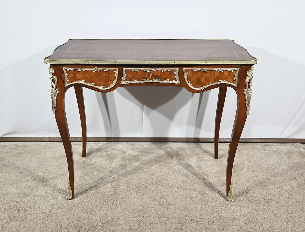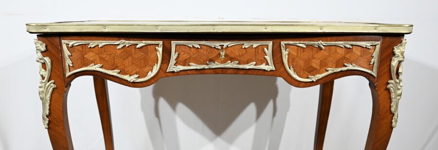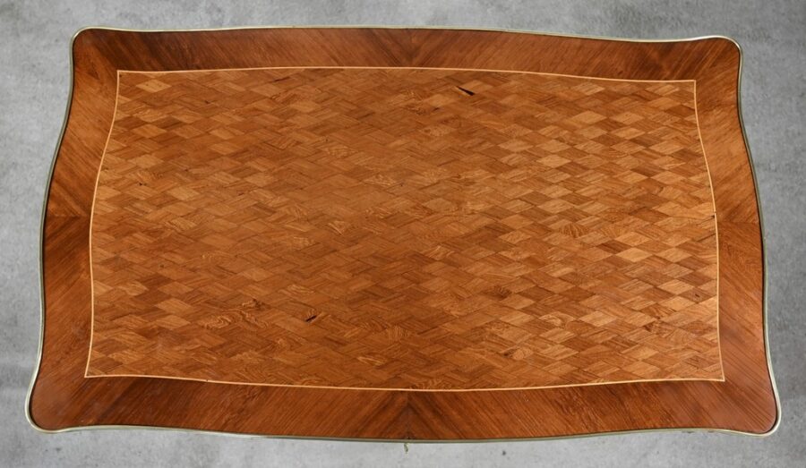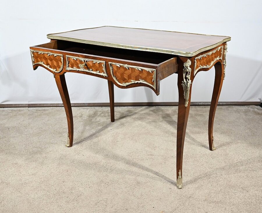 Bureau toutes faces, en placage de palissandre doté d’un dessus à encadrement avec placage en diagonale avec au centre, séparé par un filet de citronnier, une marqueterie de losanges. Ce dessus est légèrement mouvementé et habillé d’une lingotière en laiton striée. Ce meuble possède un tiroir en ceinture dont la façade est marquetée de losanges entourés de baguettes en bronze formées de rinceaux. Ce meuble repose sur des pieds légèrement galbés en coup de fouet munis en partie haute d’une chute en bronze ouvragé et d’un sabot en partie basse.