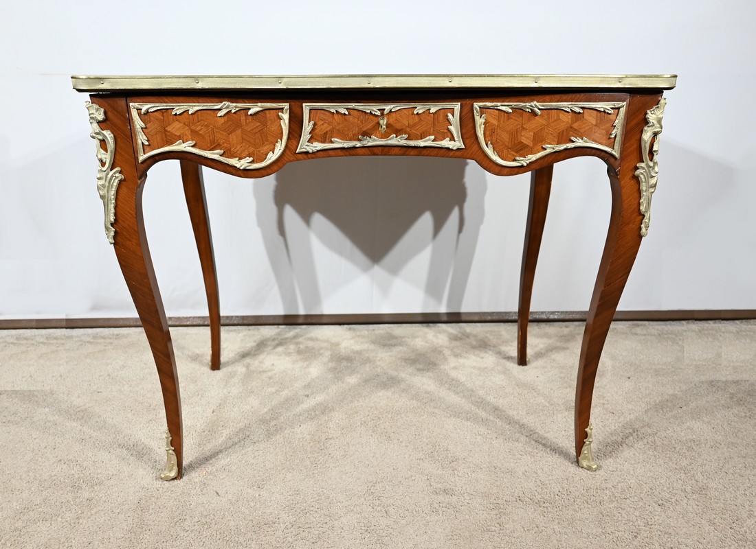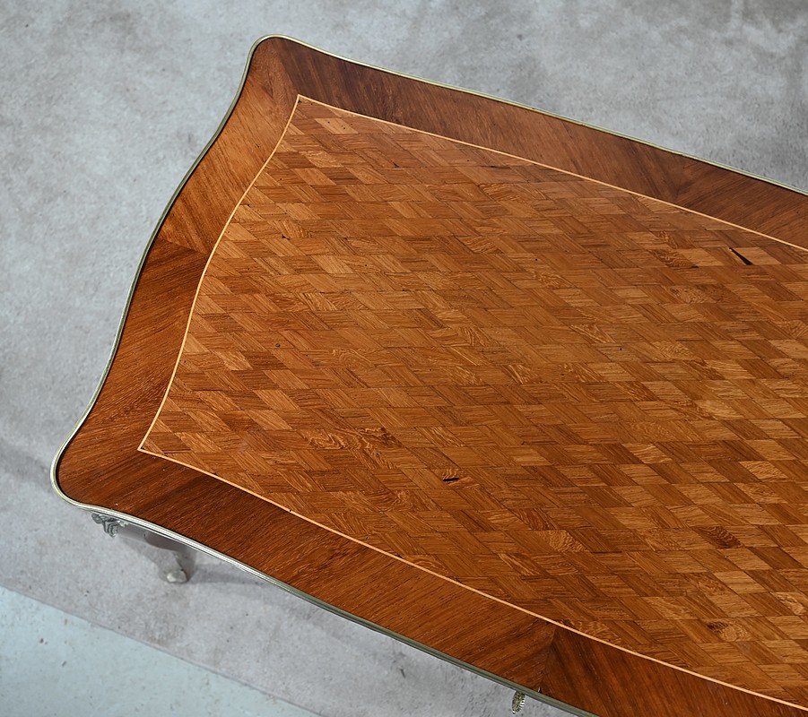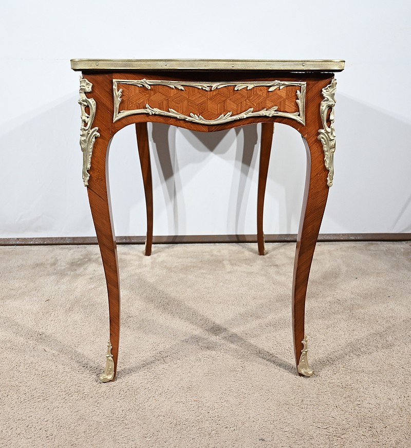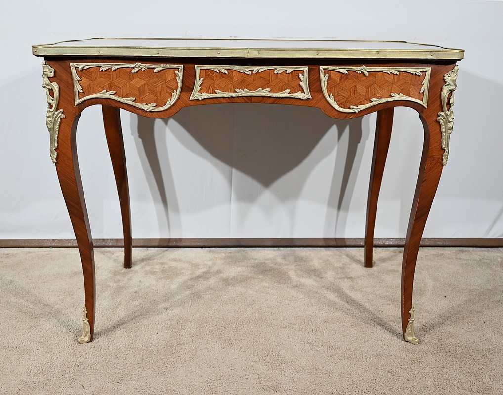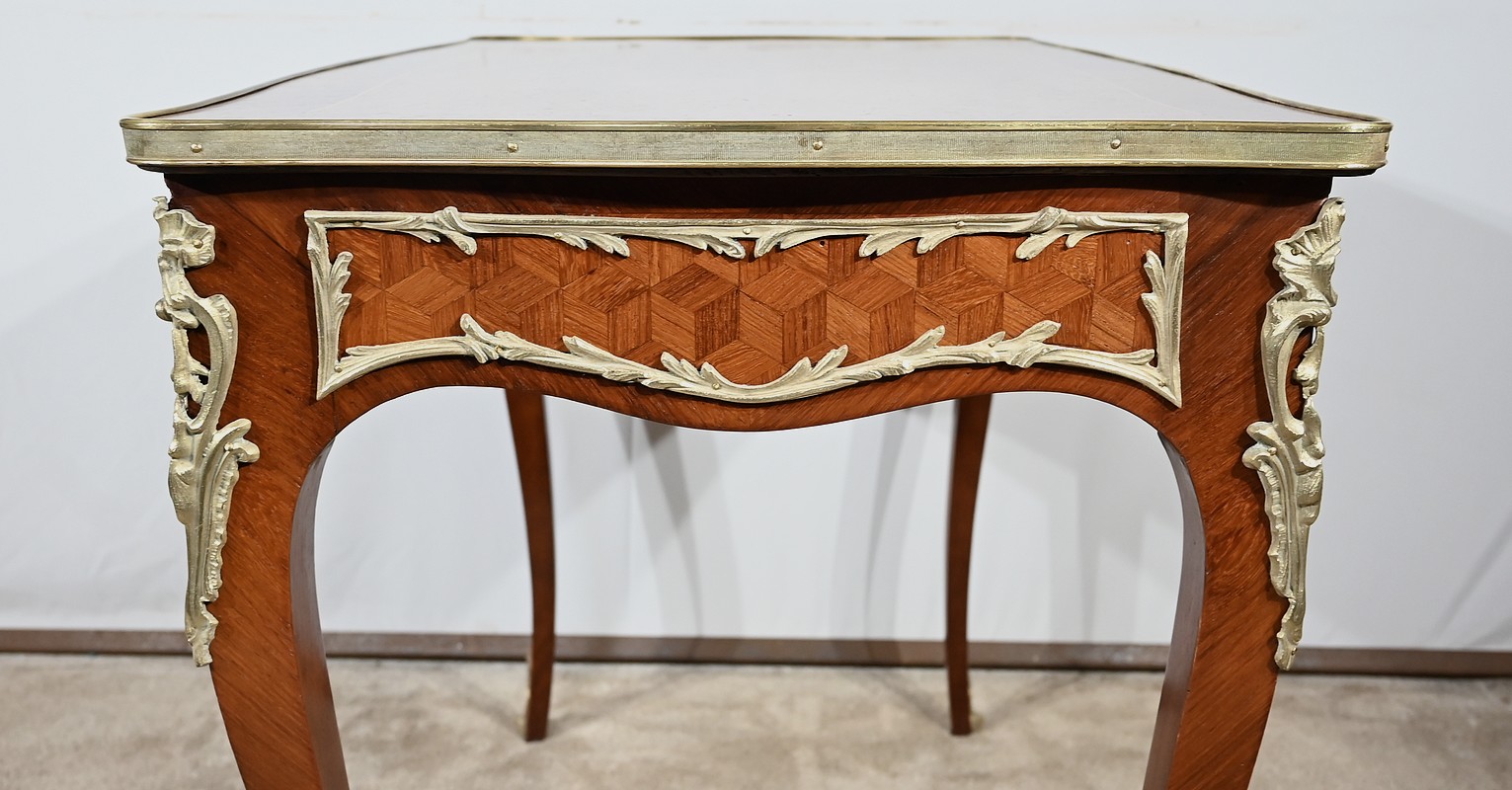 Bureau toutes faces, en placage de palissandre doté d’un dessus à encadrement avec placage en diagonale avec au centre, séparé par un filet de citronnier, une marqueterie de losanges. Ce dessus est légèrement mouvementé et habillé d’une lingotière en laiton striée. Ce meuble possède un tiroir en ceinture dont la façade est marquetée de losanges entourés de baguettes en bronze formées de rinceaux. Ce meuble repose sur des pieds légèrement galbés en coup de fouet munis en partie haute d’une chute en bronze ouvragé et d’un sabot en partie basse.