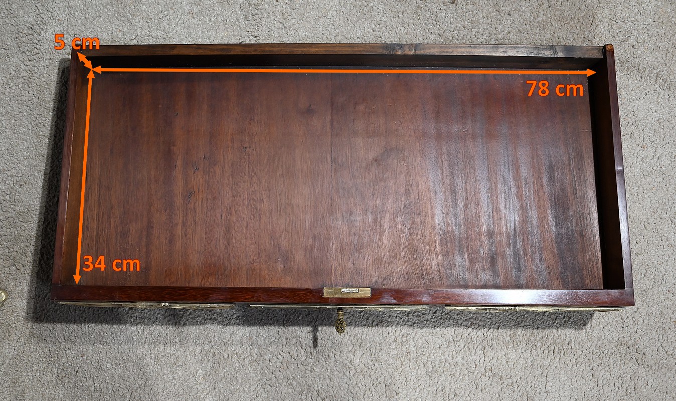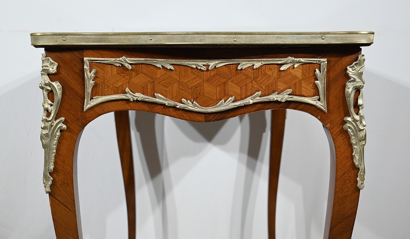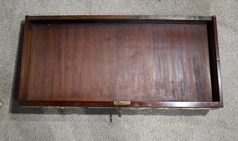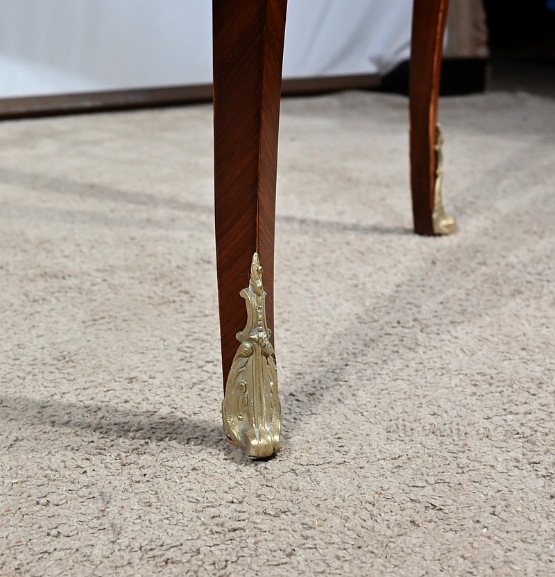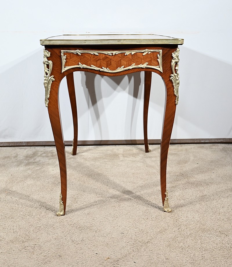 Bureau toutes faces, en placage de palissandre doté d’un dessus à encadrement avec placage en diagonale avec au centre, séparé par un filet de citronnier, une marqueterie de losanges. Ce dessus est légèrement mouvementé et habillé d’une lingotière en laiton striée. Ce meuble possède un tiroir en ceinture dont la façade est marquetée de losanges entourés de baguettes en bronze formées de rinceaux. Ce meuble repose sur des pieds légèrement galbés en coup de fouet munis en partie haute d’une chute en bronze ouvragé et d’un sabot en partie basse.