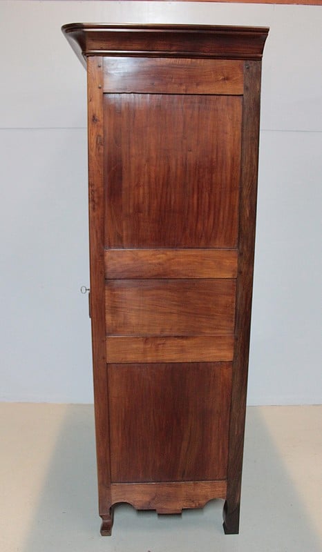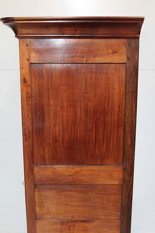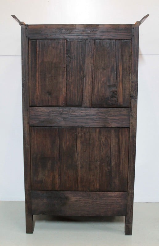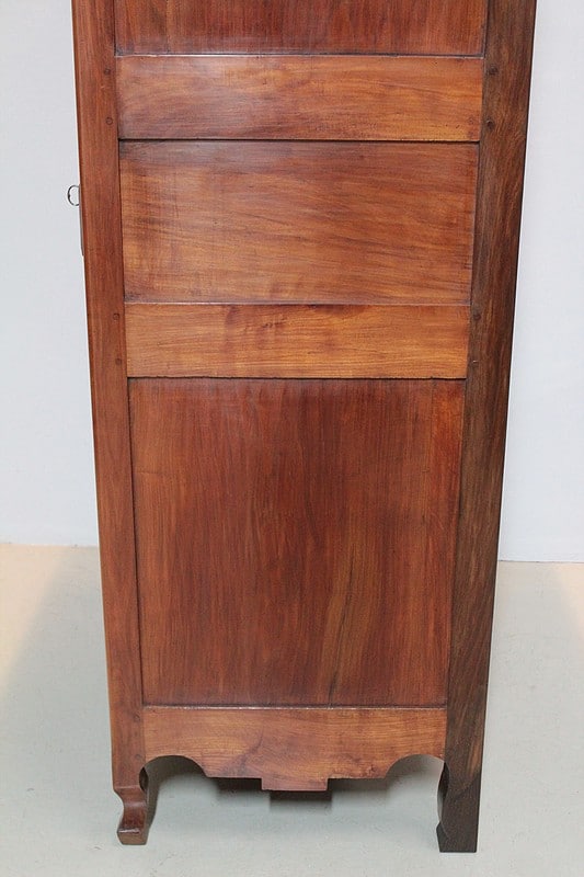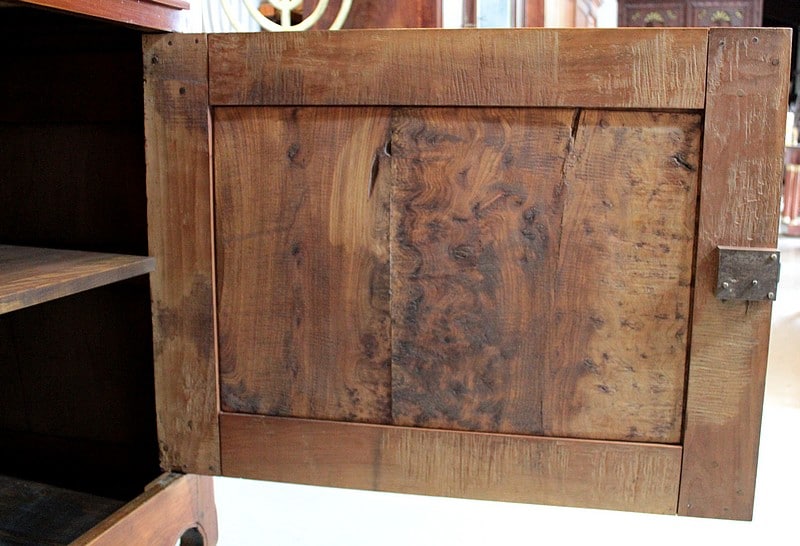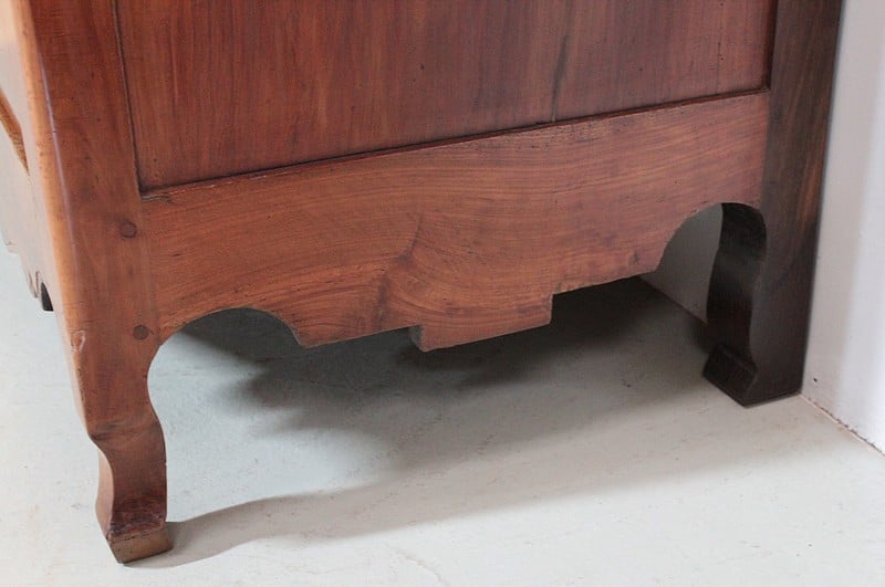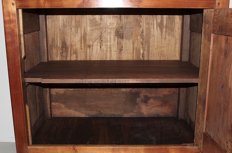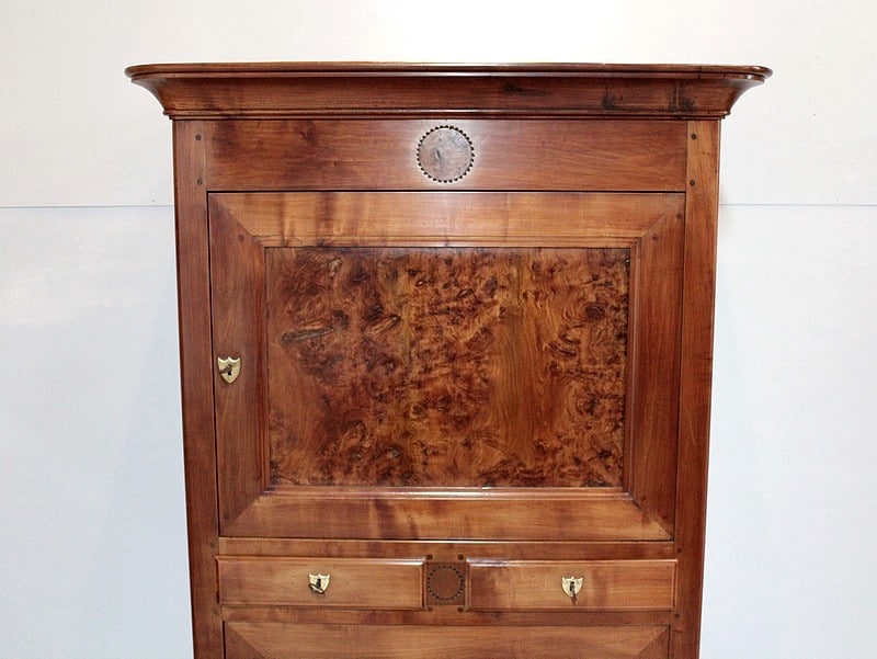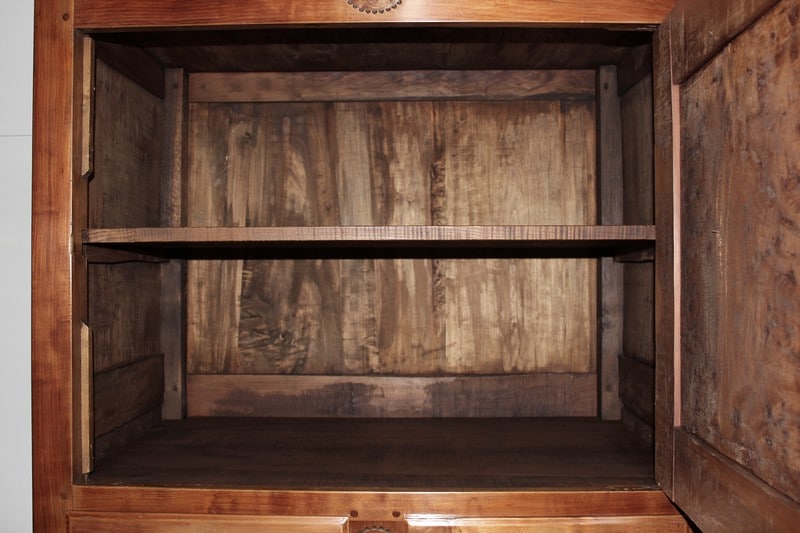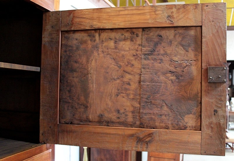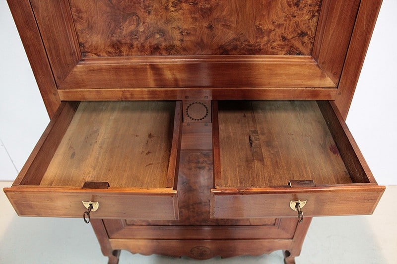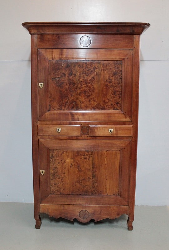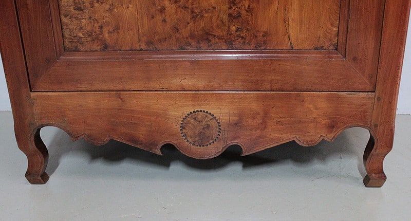 Cabinet de style Louis XV en merisier, panneaux de portes à découpes droites en loupe de frêne massive et montants arrières en châtaignier.