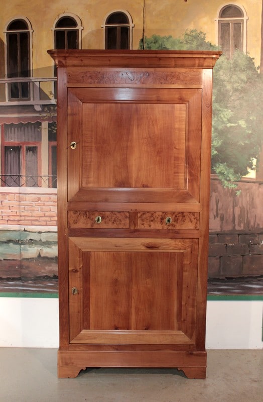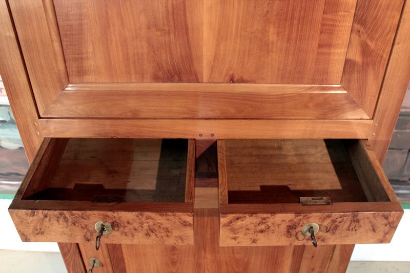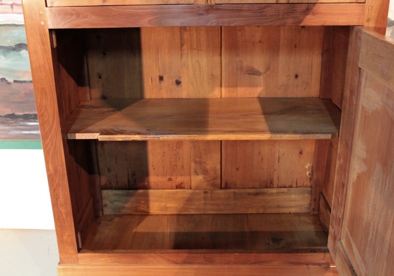 Cabinet Louis-Philippe en merisier et frêne pour la traverse haute et la façade des 2 tiroirs. Il ouvre par deux portes et chaque compartiment est garni d’une étagère. Région de Vendée. Époque : seconde moitié du XIXe siècle.