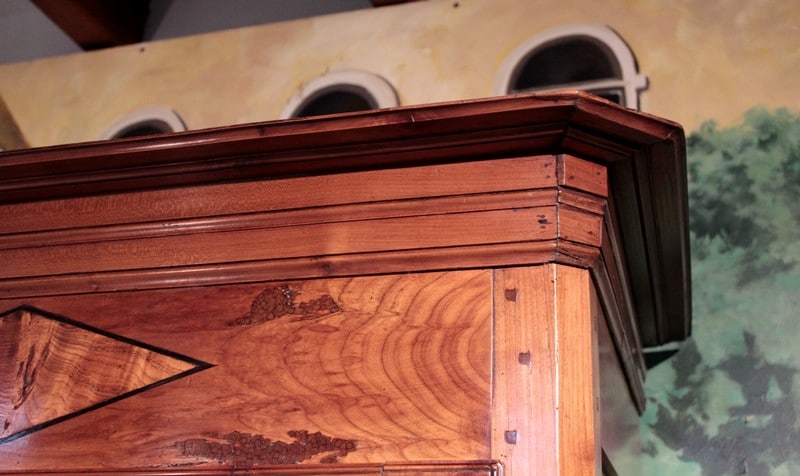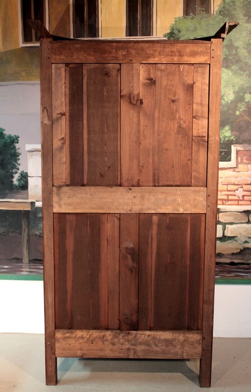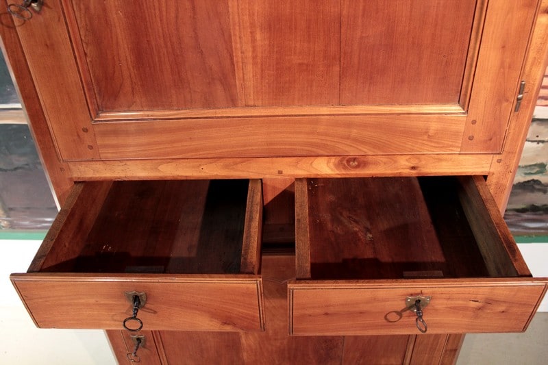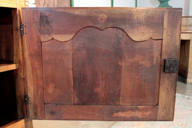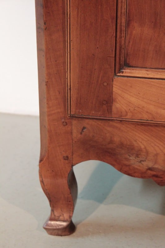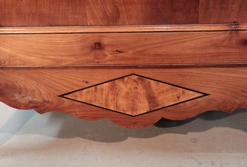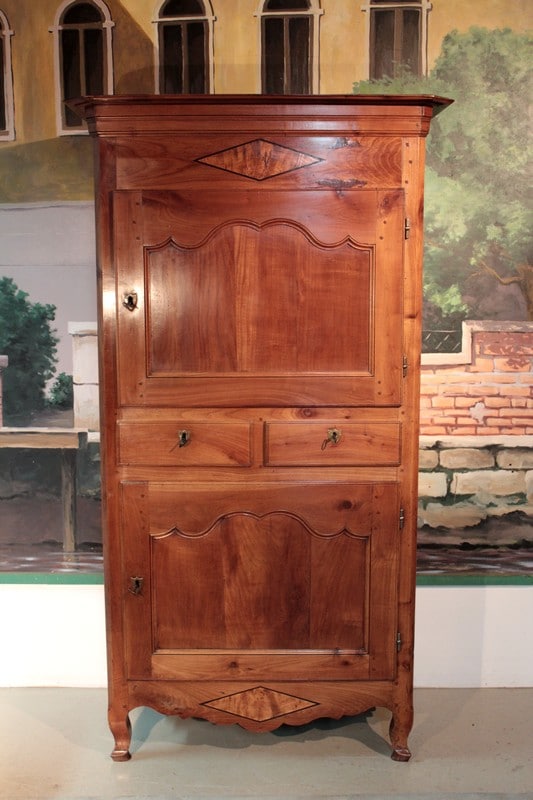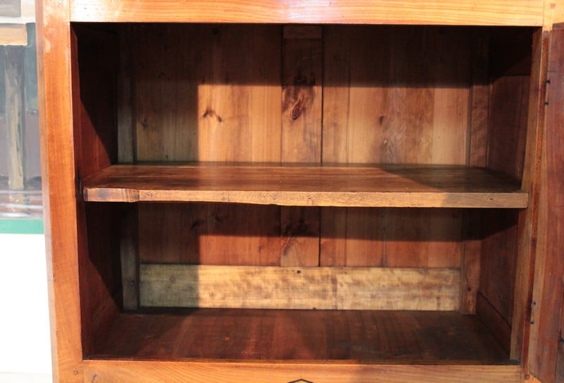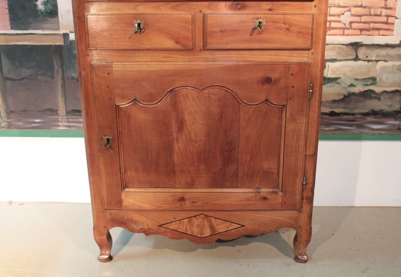Cabinet de style Louis XV en merisier ouvrant par 1 porte en partie haute, 2 tiroirs au milieu et 1 porte en partie basse. Les portes sont à découpe et les traverses, haute et basse, sont ornées d’une marqueterie en forme de losange. Très petites fiches et entrées en cuivre de la région des Deux-Sèvres. Époque : première moitié du XIXe