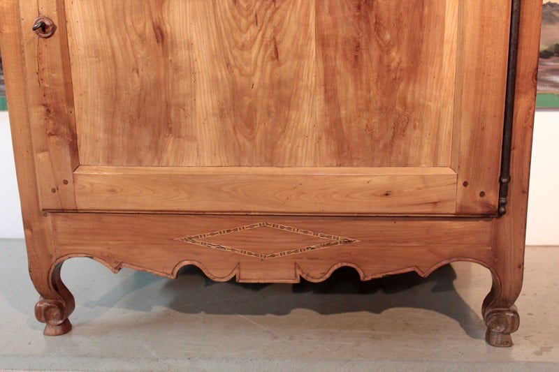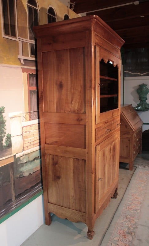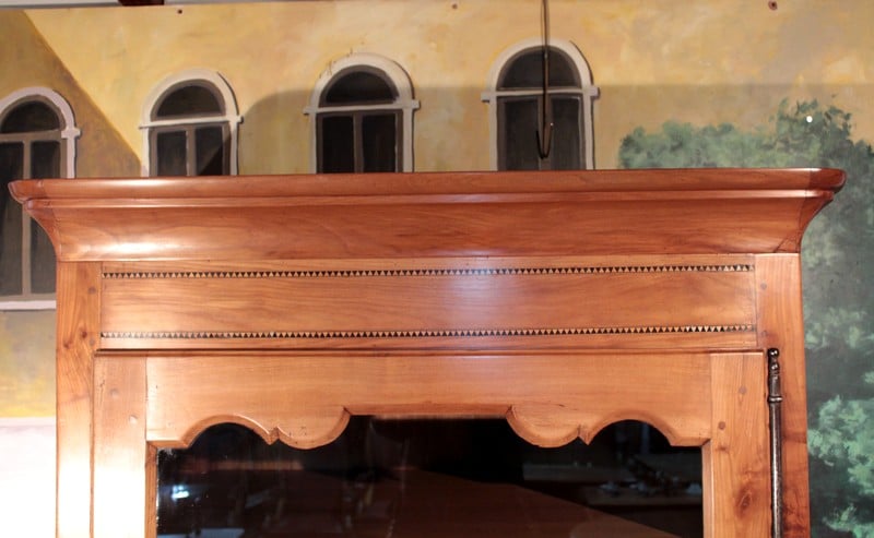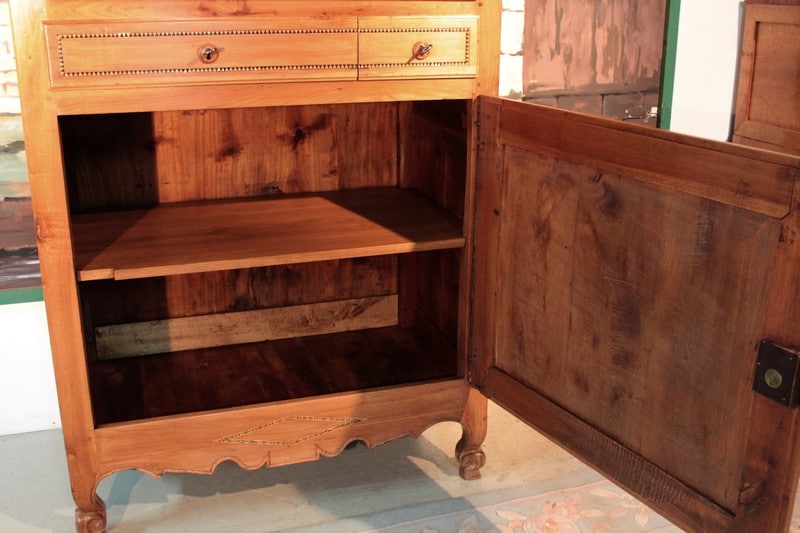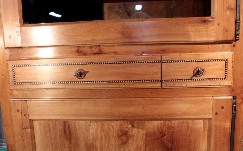 Cabinet Louis XV en merisier avec filet de marqueterie sur les traverses et les tiroirs. Il ouvre par une porte vitrée en partie haute, 2 tiroirs au milieu – fermant à clé – et une porte pleine en partie basse.Fiches de fer et pieds antérieurs à enroulement. Région des Deux -Sèvres. Époque : milieu XIXe.