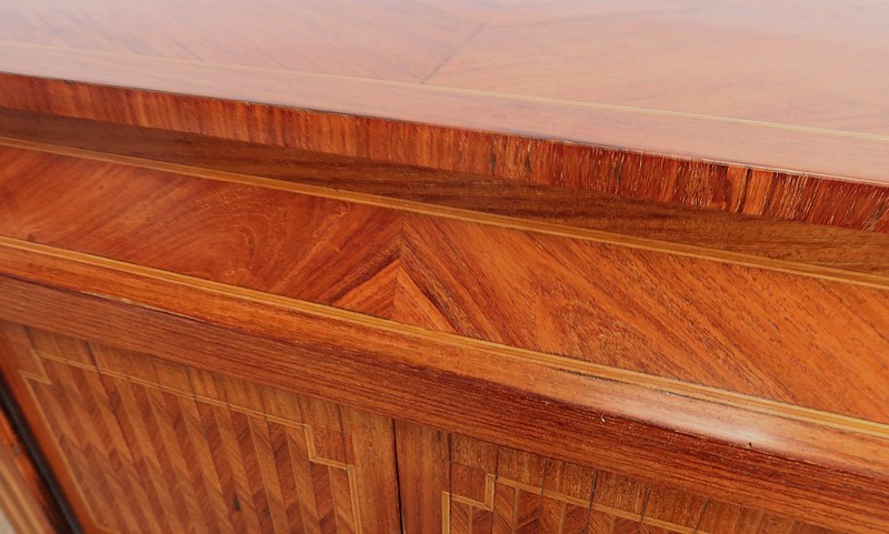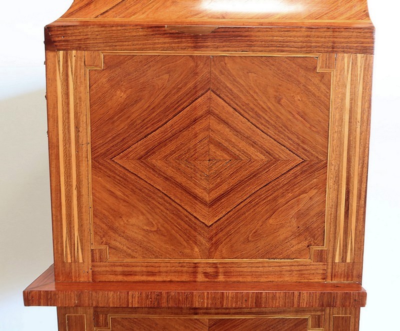 Ce meuble est enjolivé, sur le dessus, les côtés ou encore la façade du tiroir, de marqueteries en bois de violette, tantôt en frises tantôt en ailes de papillon. Elles sont soulignées par des filets de citronnier et de bois teinté vert, que l’on retrouve également sur la tablette et sur toutes les faces visibles des pieds.