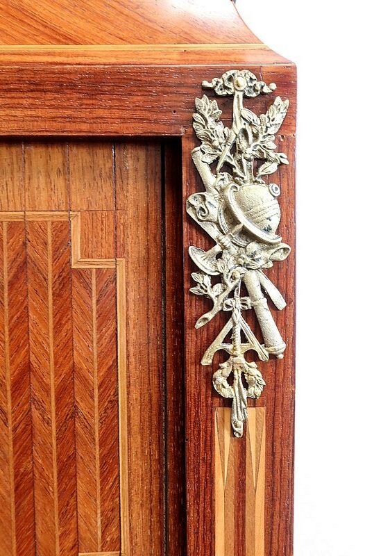 Il se compose de deux portes à rideaux, coulissantes latéralement, dotées de boutons de tirage en bronze. Des filets à coins grecs encadrent une succession de marqueteries en chevrons, permettant la mobilité de ces portes. Les montants sont ornés en partie haute de chutes en bronze à décors d’instruments et de feuillages.