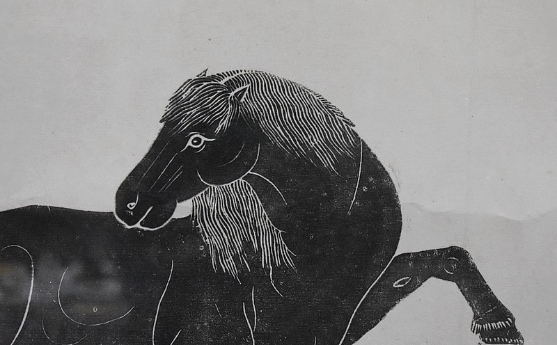 Cadre sous verre en aluminium représentant une jument couchée, sans doute prête à mettre bas.