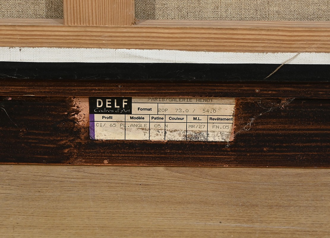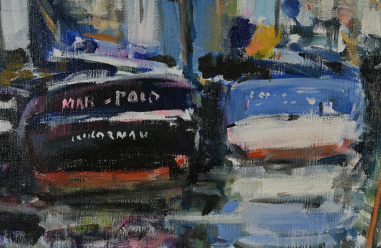 Belle peinture Marine figurant une scène portuaire à Concarneau. On y voit plusieurs bateaux amarrés, avec des bâtiments en arrière-plan. Les couleurs sont principalement des nuances de bleu, gris et blanc, avec quelques touches de jaune et rouge. Un personnage en ciré jaune et casquette est visible au premier plan, ce pêcheur travaille sur un des bateaux. L’atmosphère est brumeuse, suggérant un matin nuageux. Le cadre mouluré du tableau est doré et laqué de noir. Le nom de l’artiste et la date : « Blaszczyk St. 91 », sont visibles en bas à droite du tableau.