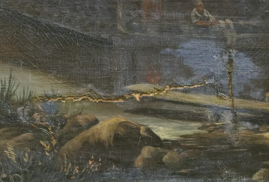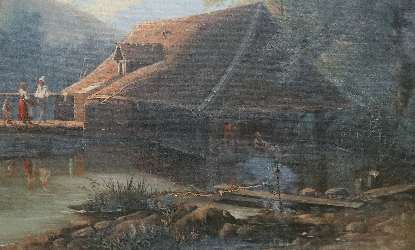 Belle huile sur toile représentant un lavoir traversé d’une rivière et relié à la berge par un petit pont en bois. En arrière plan, nous découvrons un paysage vallonné surplombé d’une cité entourée de remparts dont les formes surgissent au loin. La vallée est foisonnante de végétation. Des arbres en dégradés de verts apparaissent en clair-obscur. En effet, le soleil termine sa course et commence à assombrir la scène. Le ponton rejoignant le lavoir est traversé par plusieurs personnages : une femme portant une panière remplie de linge sur sa tête, une enfant touchant l’eau de son bâton et enfin une autre femme discutant avec un homme. Leurs habits traditionnels datent du XIXe ou XVIIIe siècles. Dans le lavoir, nous observons une femme portant une coiffe, lavant son linge.