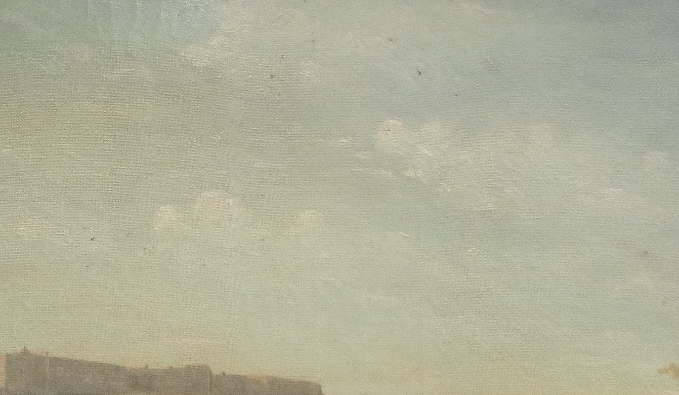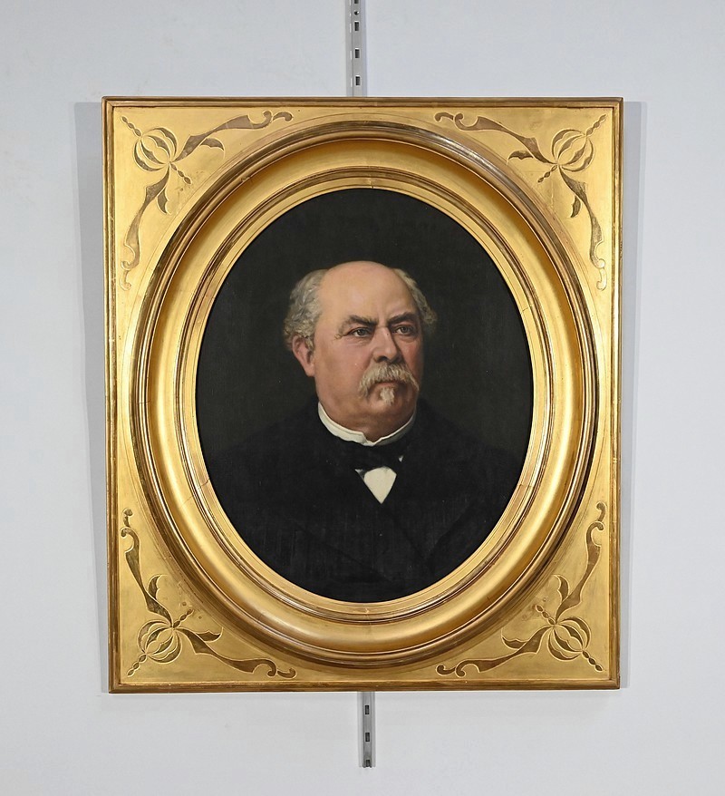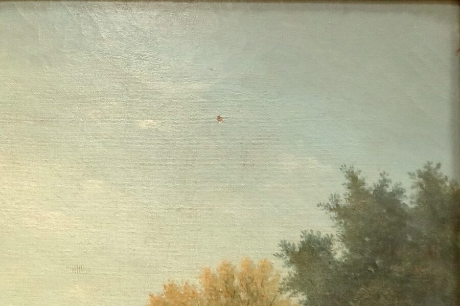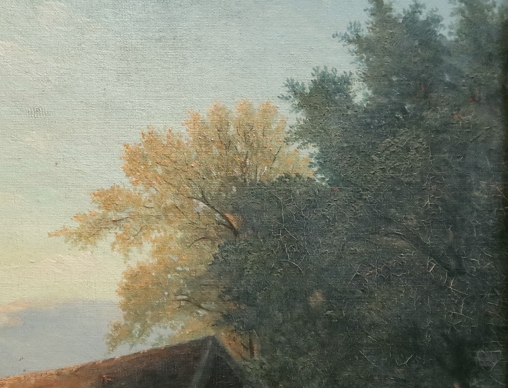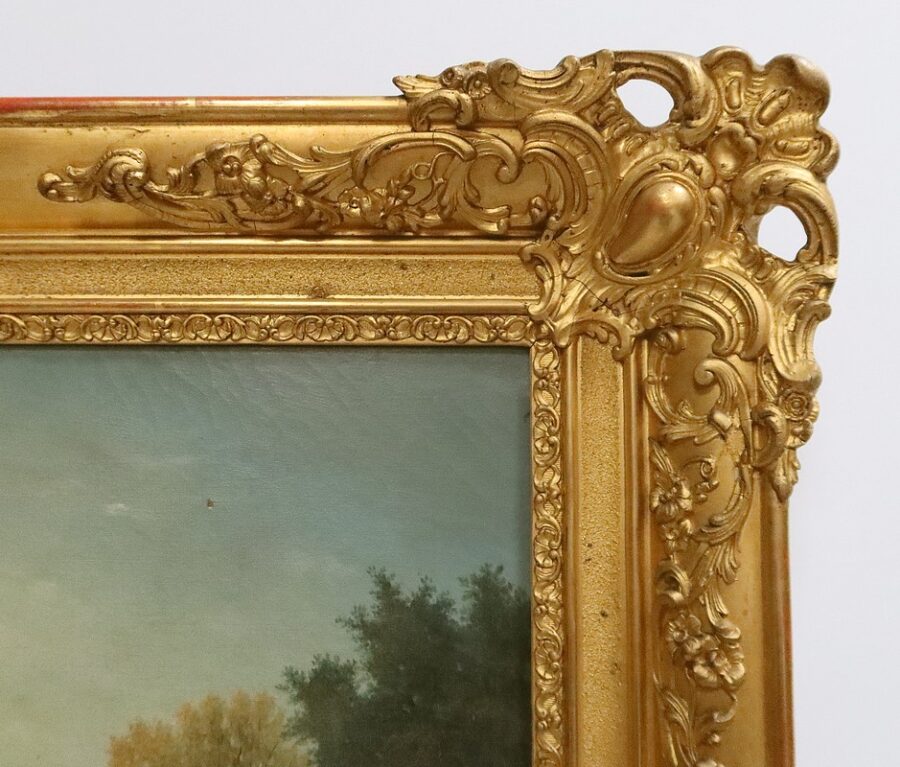 Entourant la toile, un magnifique cadre sculpté en bois doré s’accorde parfaitement à cette scène bucolique. Riche en ornementations sur ses quatre angles, il présente également des moulures stylisées richement ciselées.