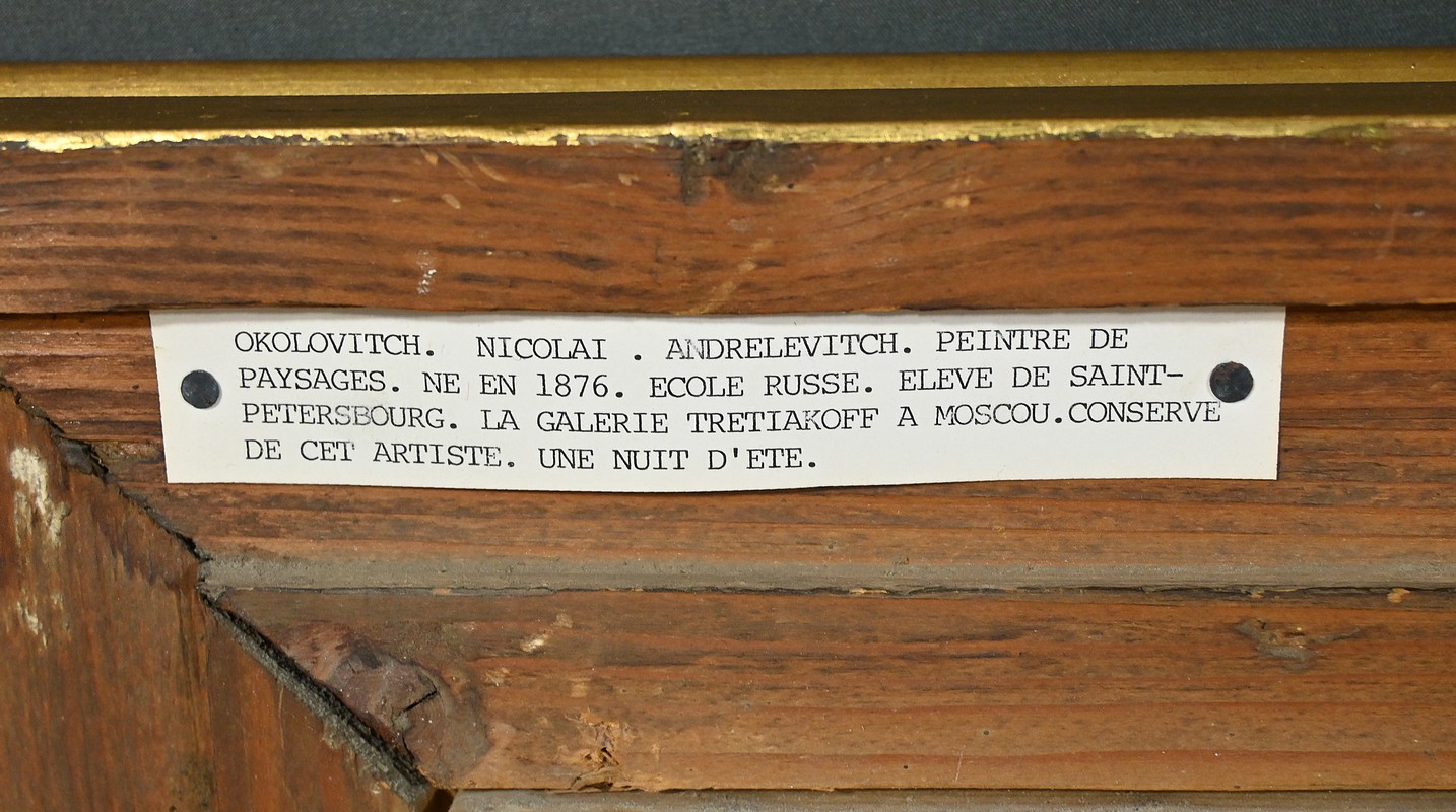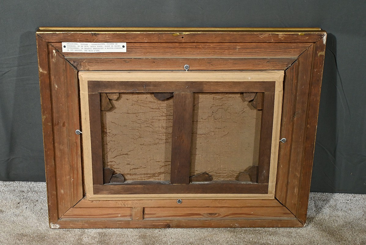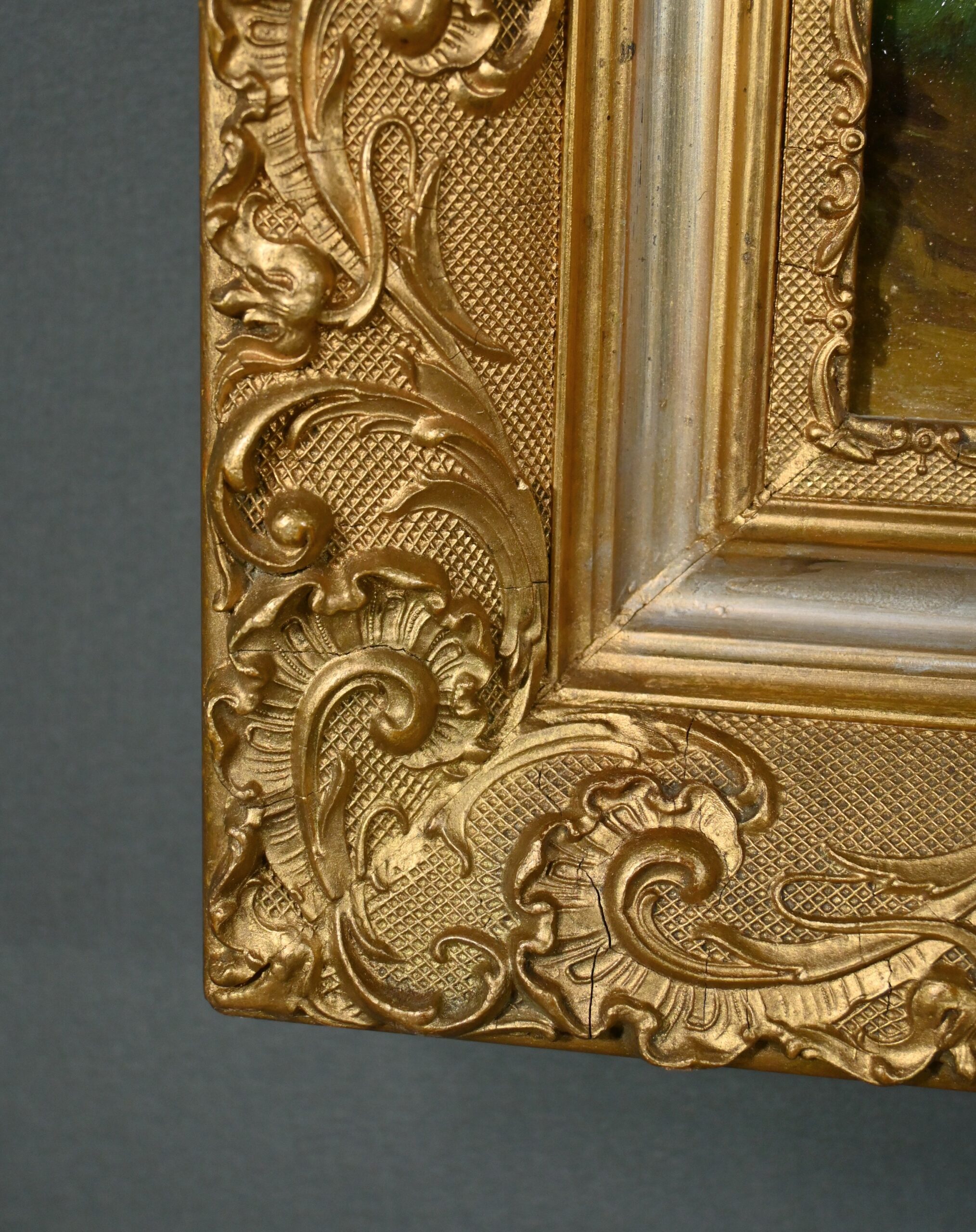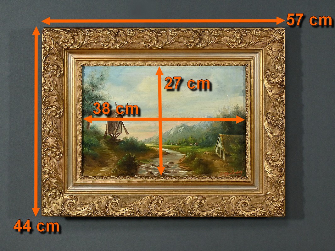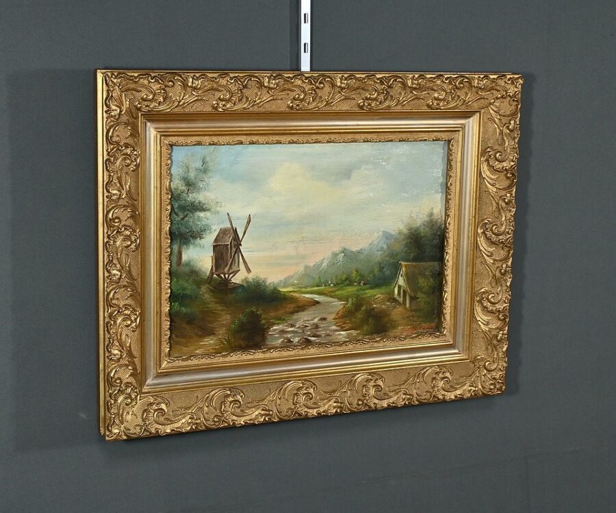 Ce tableau signé N. Okolowicz représente un paysage pittoresque avec un moulin à vent en bois situé sur une colline à gauche. Un chemin serpente depuis le moulin jusqu’à une rivière, ajoutant une dimension dynamique à la scène. À droite de la rivière, une cabane se niche parmi la végétation luxuriante, créant un contraste charmant avec le moulin. En arrière-plan, des montagnes majestueuses se dressent sous un ciel partiellement nuageux, ajoutant une profondeur et une grandeur à la composition. Le cadre richement orné, avec des motifs dorés complexes, accentue la beauté de cette œuvre, témoignant du talent et de l’attention portée aux détails par l’artiste. Ce tableau capture parfaitement la quiétude et la beauté de la nature, invitant le spectateur à se perdre dans ce paysage enchanteur.