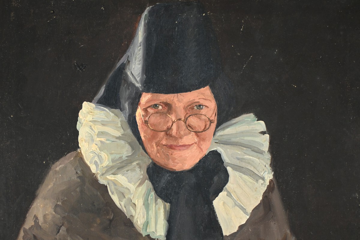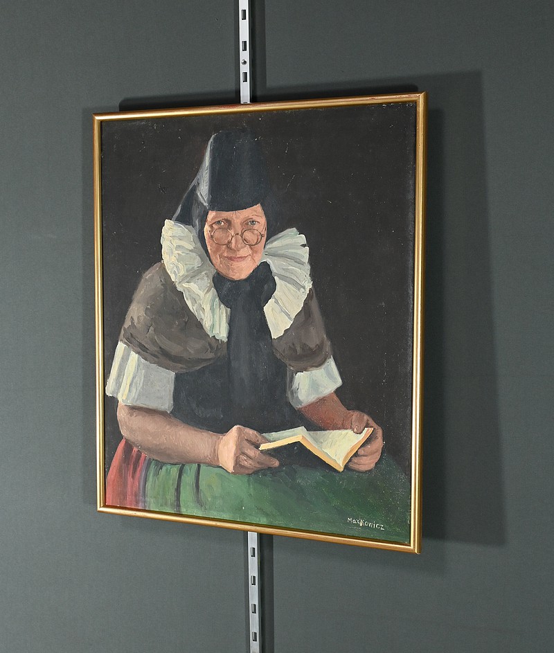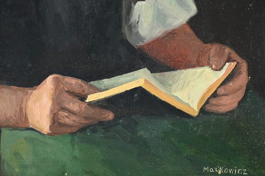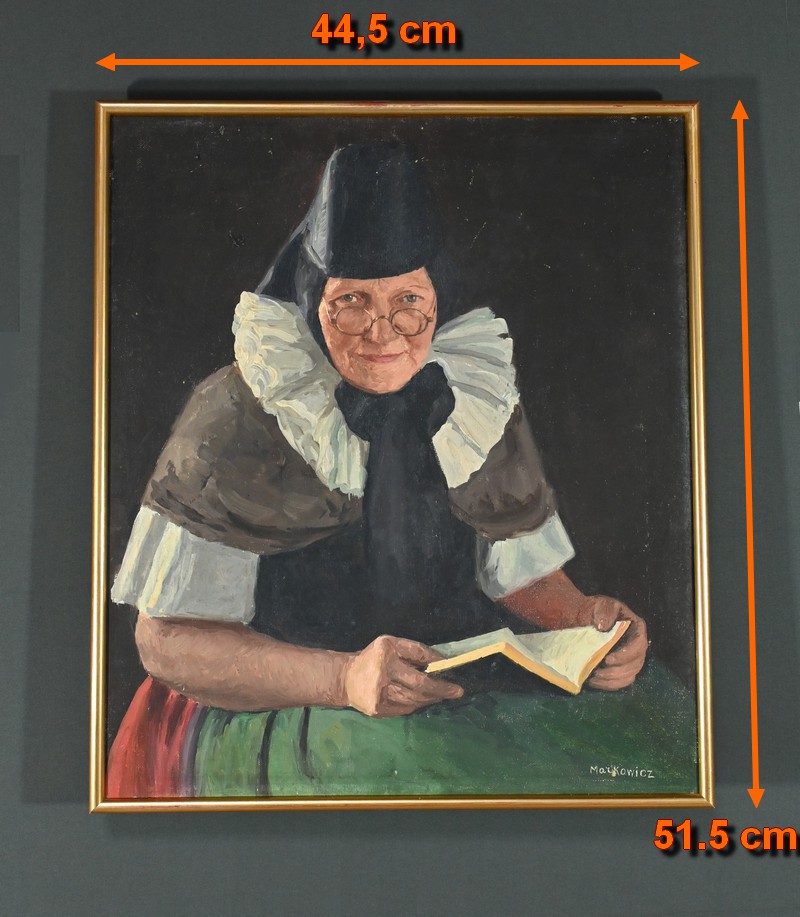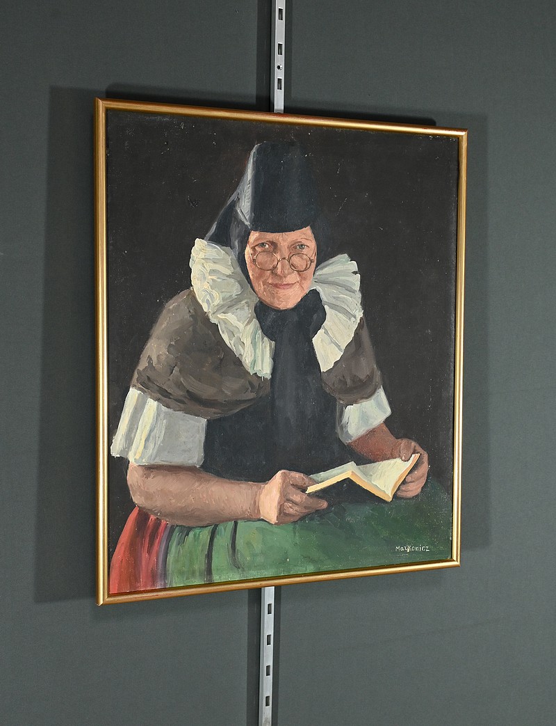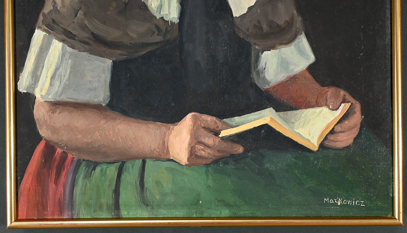 Huile sur toile de l’Artiste Artur Markowicz (1872-1934) représentant une femme âgée coiffée et vêtue d’un costume traditionnel polonais. Assise, son visage bienveillant face à l’artiste, elle tient un livre ouvert posé sur ses genoux. L’artiste connu pour ses portraits intimistes, arrive a retranscrire la personnalité généreuse de cette femme. L’œuvre est signée en bas à droite.