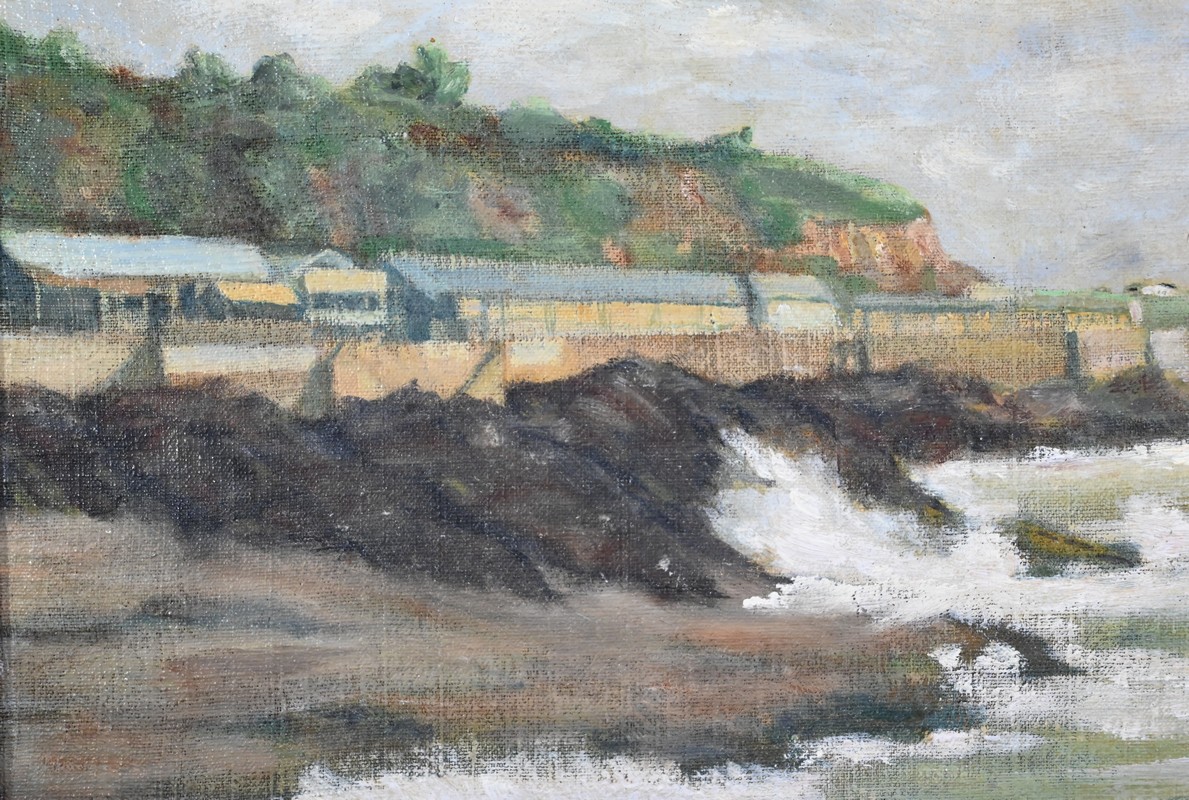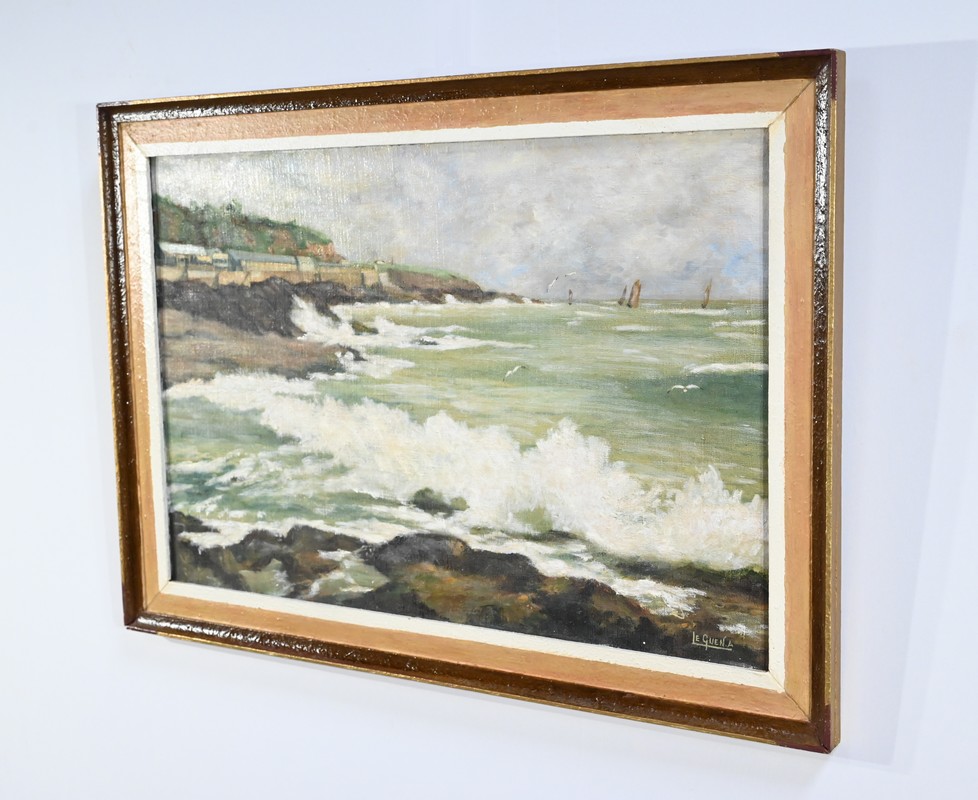 Dans cette œuvre, Le Guen représente un paysage côtier au ciel chargé de nuages. Les planches à voile évoluent sur une mer agitée qui vient frapper ses vagues sur les rochers. Quelques habitations et bâtiments surplombent ce littoral.