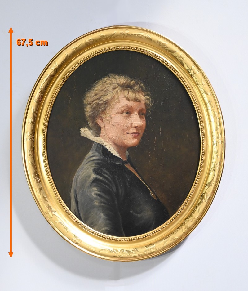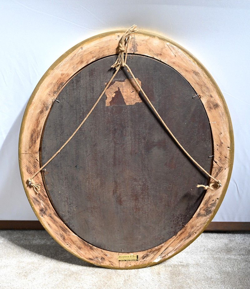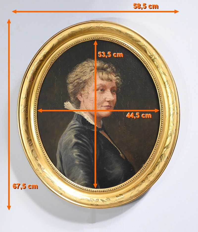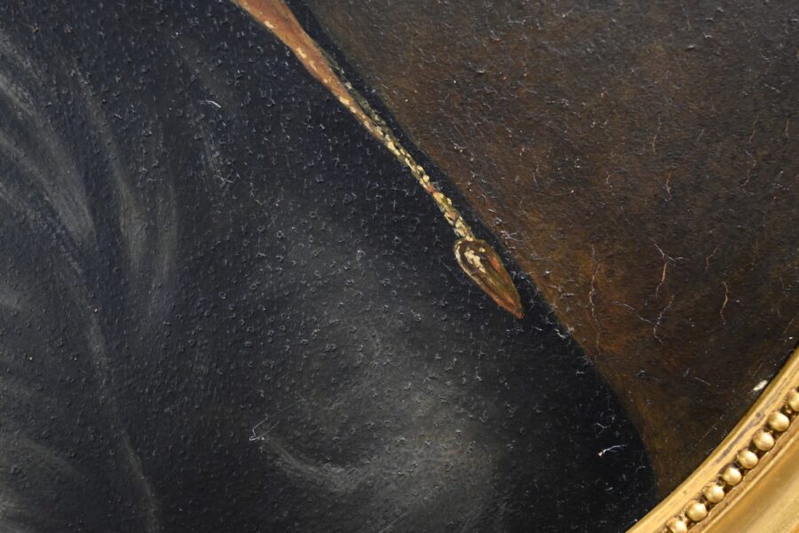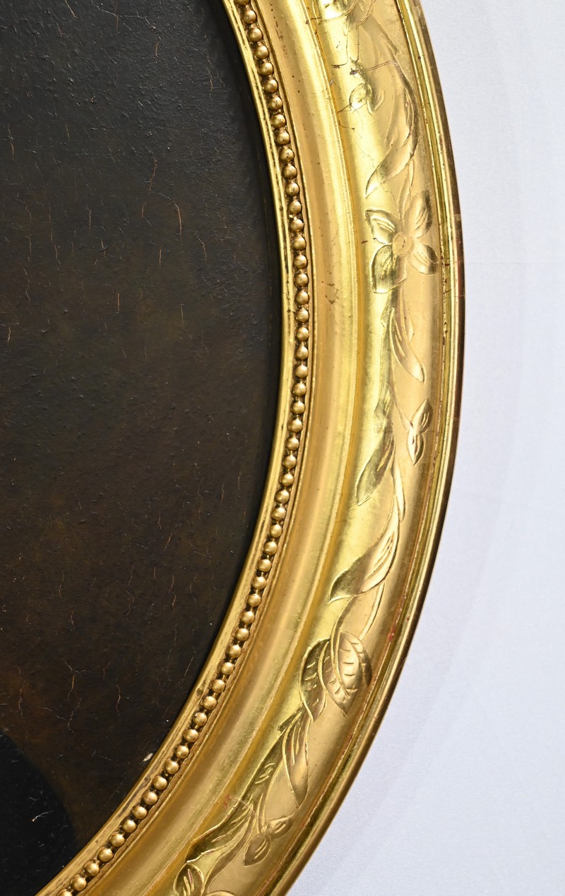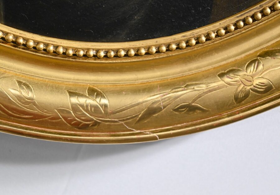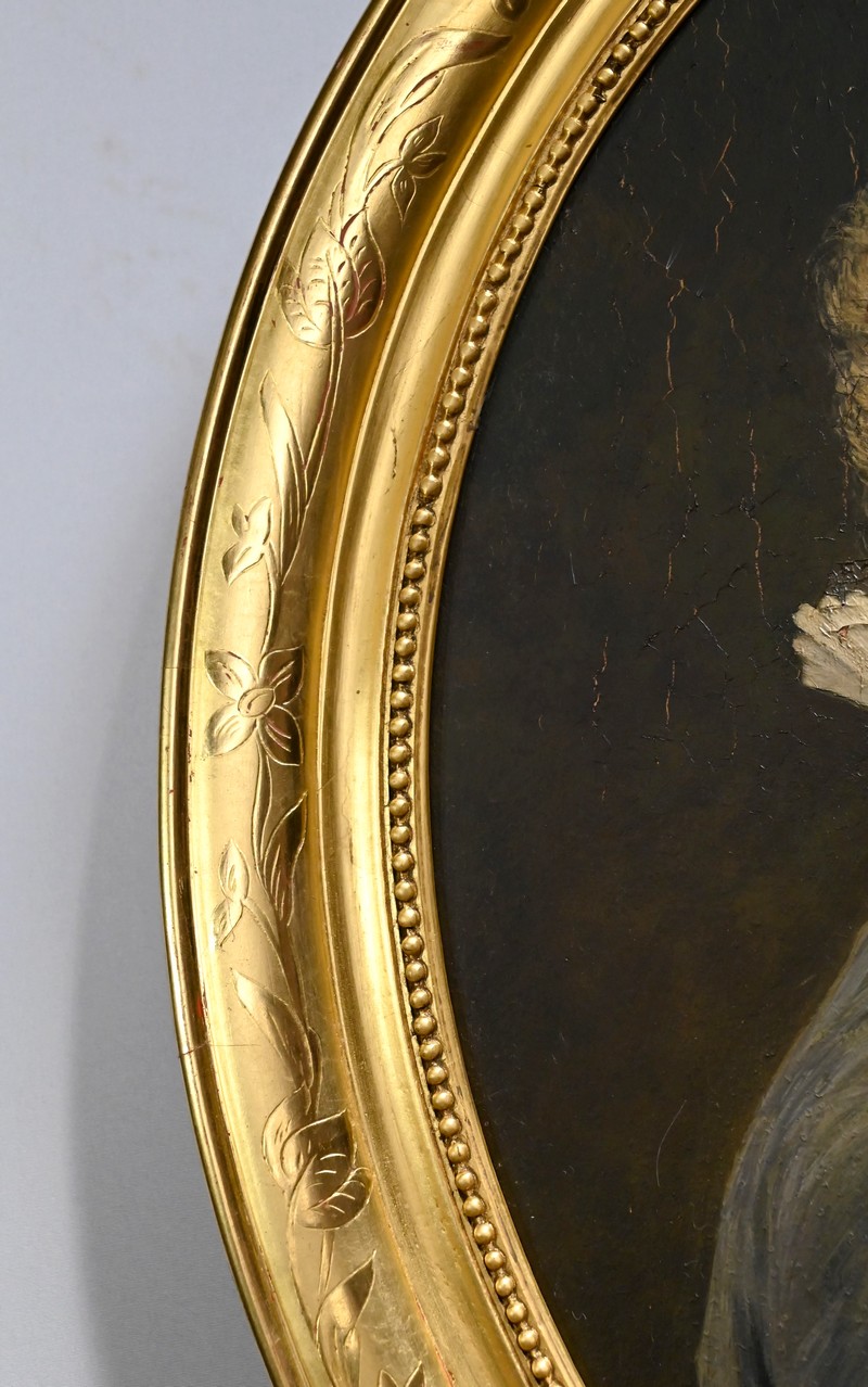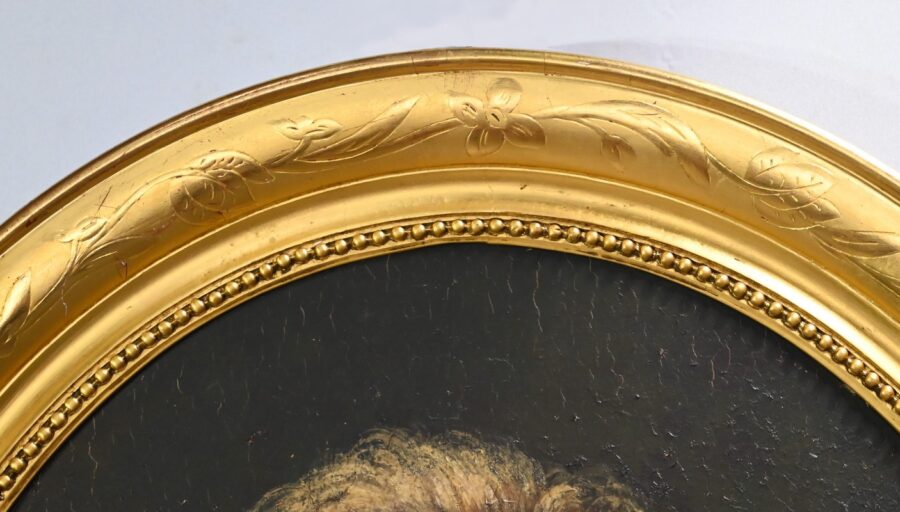 Cette peinture est présentée dans un cadre ovale à fortes moulurations et perlé dans le pourtour intérieur. Ce cadre est doré à la feuille et agrémenté de gravure de feuilles et de fleurs.
