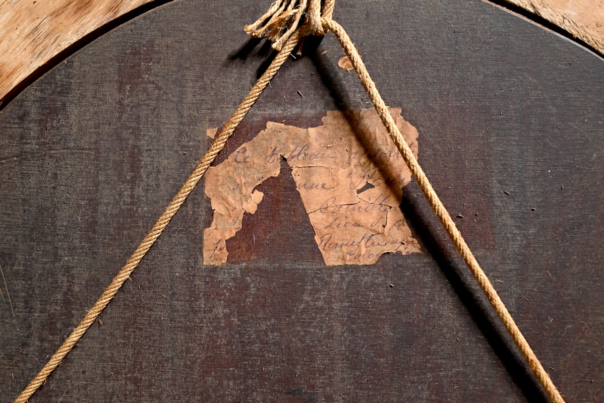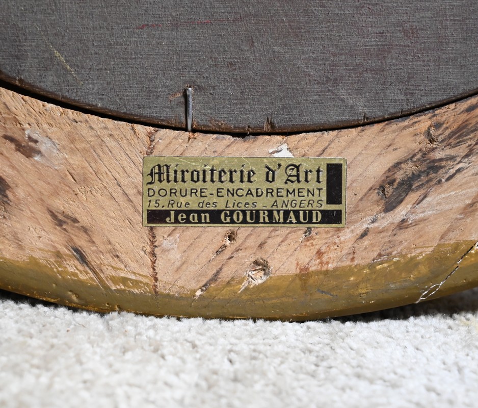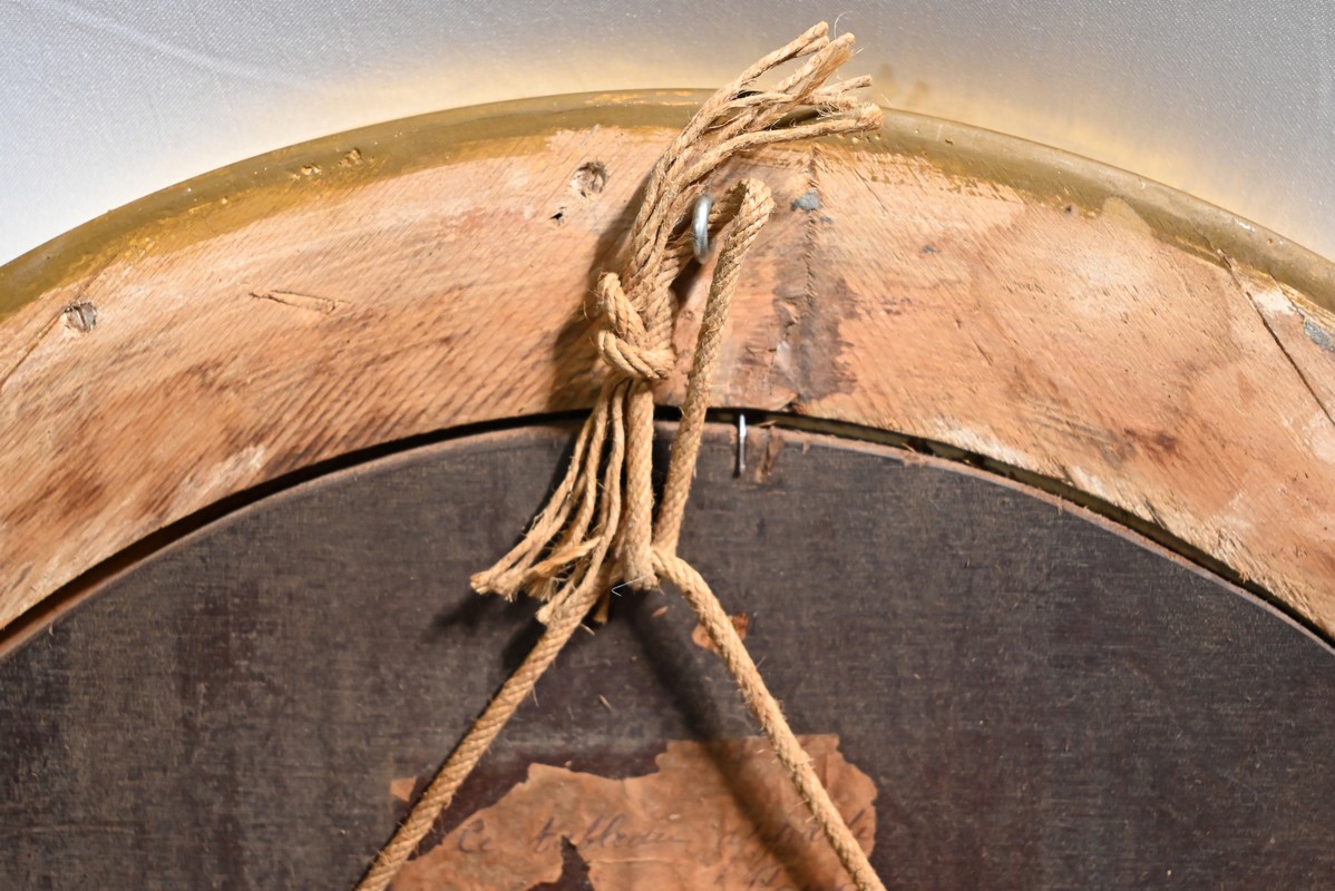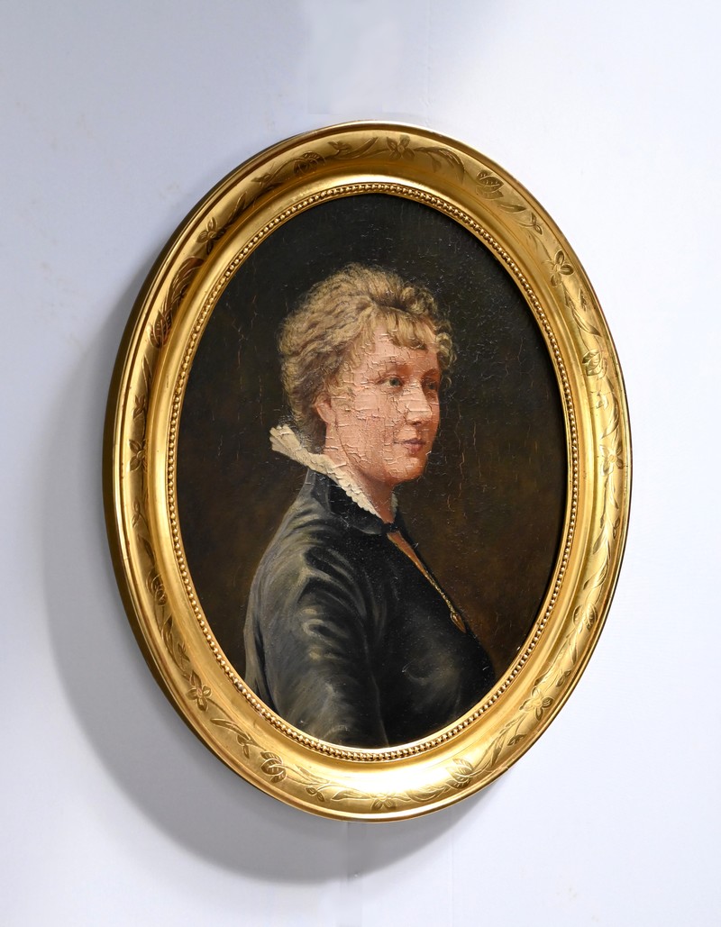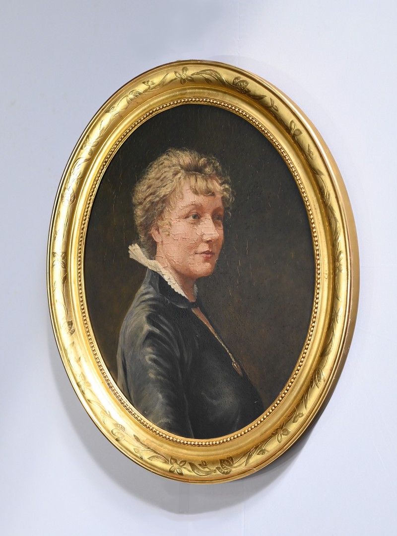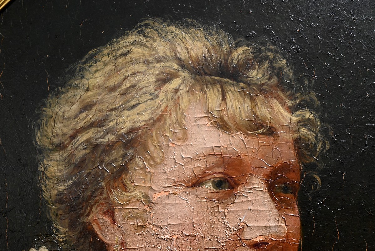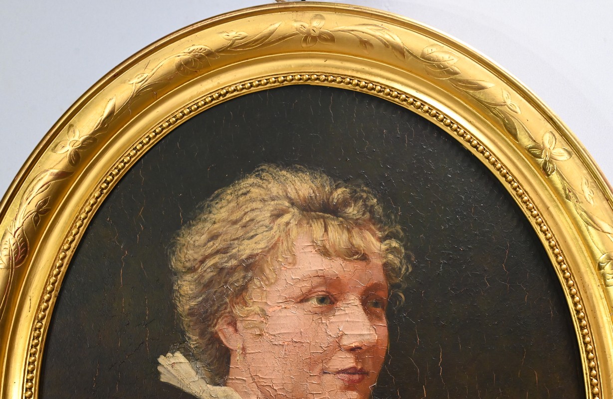 Cette peinture est présentée dans un cadre ovale à fortes moulurations et perlé dans le pourtour intérieur. Ce cadre est doré à la feuille et agrémenté de gravure de feuilles et de fleurs.