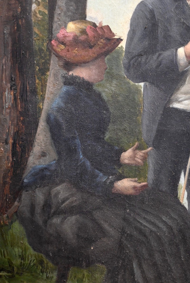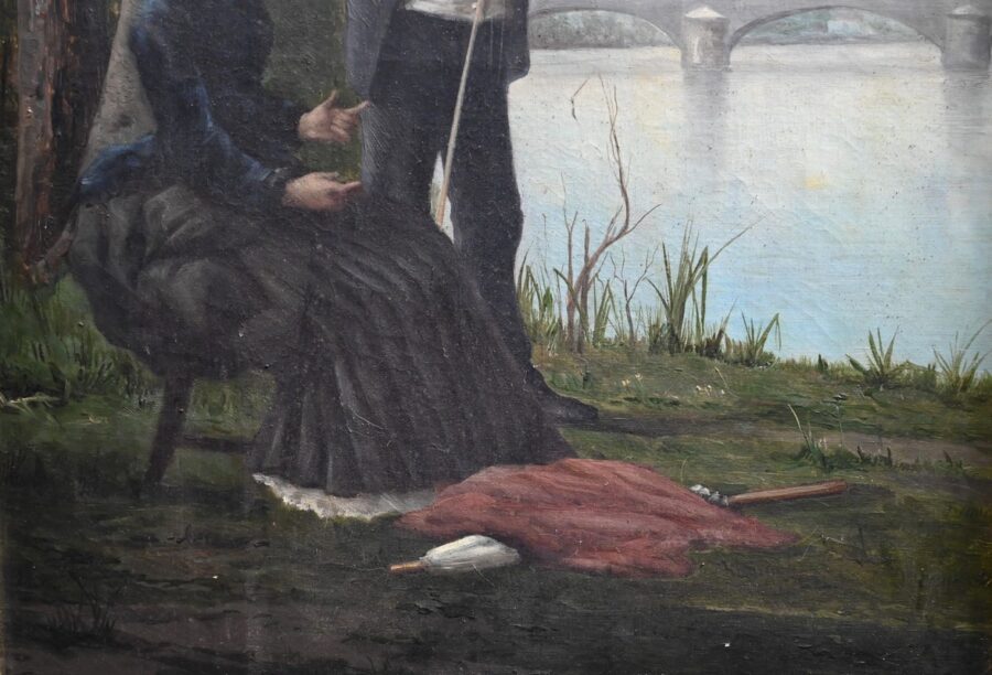 Cette dernière, assise, semble tenir une discussion avec son compagnon totalement absorbé par la préparation de sa canne à pêche.