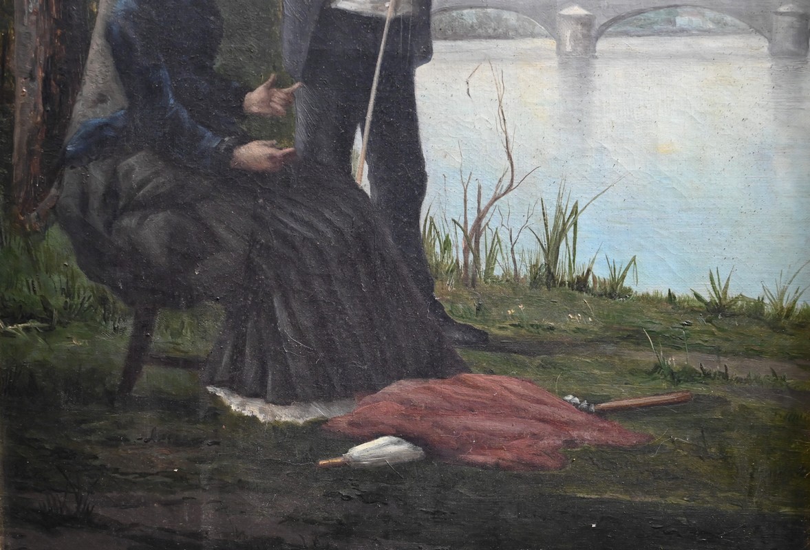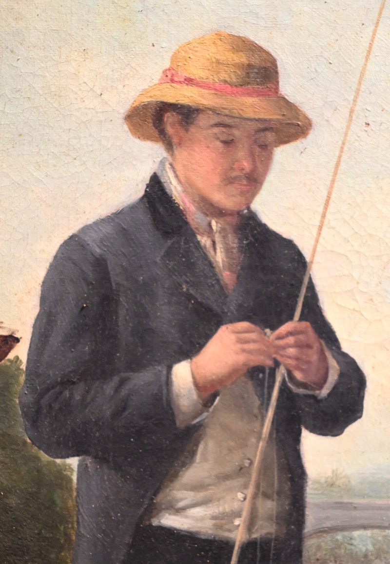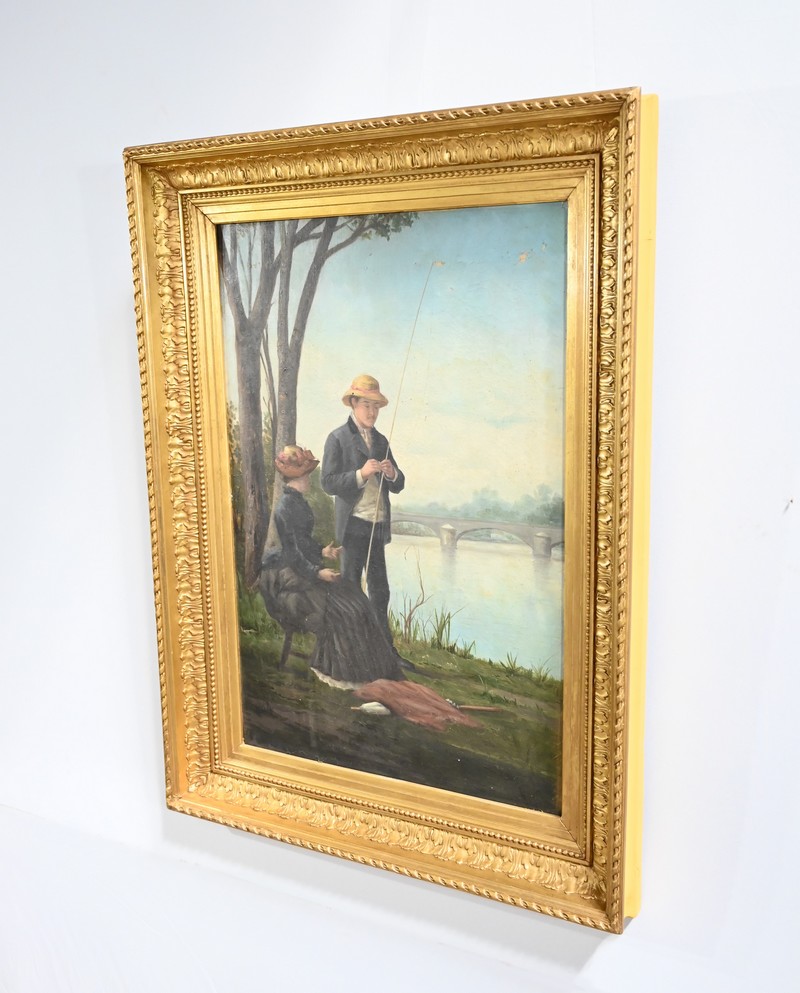 Cette œuvre figure un pêcheur à la ligne et sa femme sur les berges d’un fleuve.