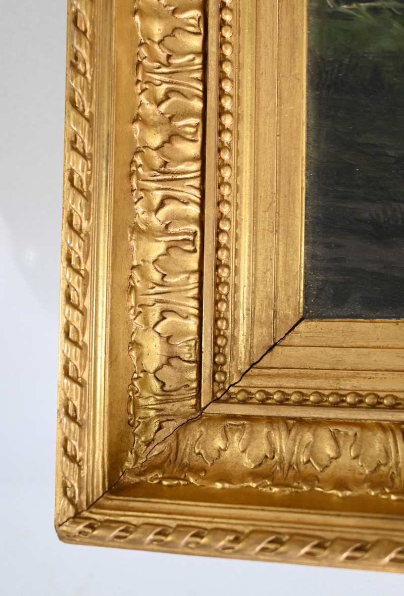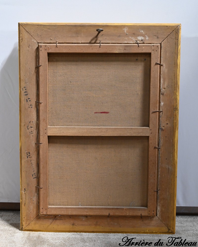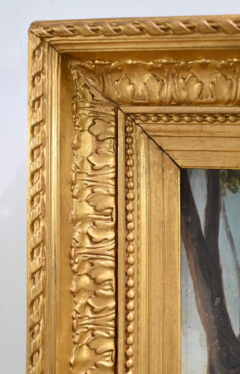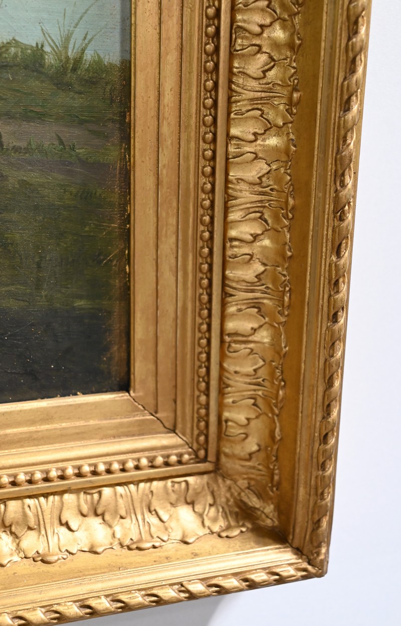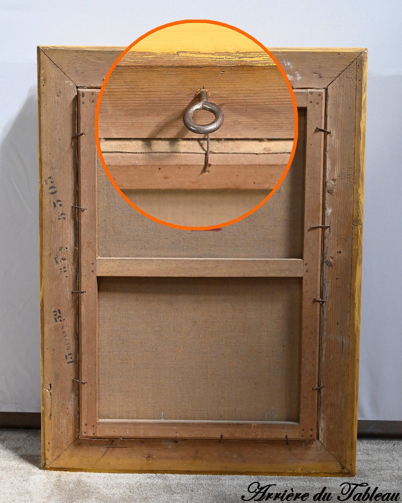 Cette toile est mise en valeur par un cadre doré à décor de cordelette, de perlé et de frise de feuilles d’acanthe.