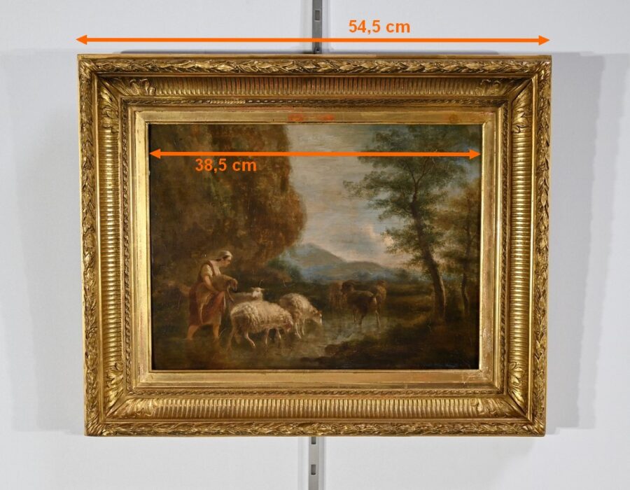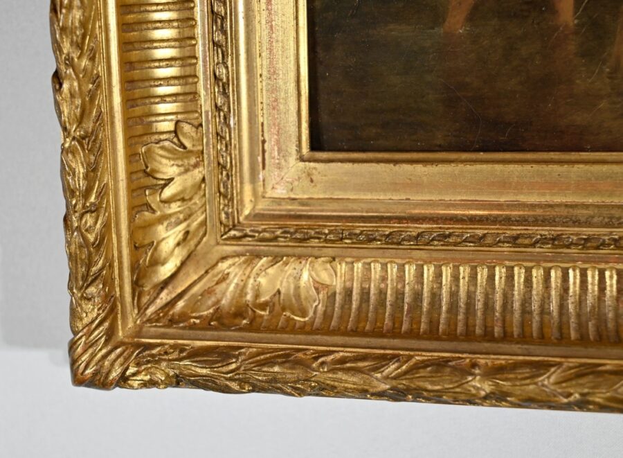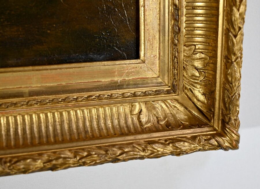 Ce tableau présente un cadre doré, sculpté de rinceaux, de fleurs d’acanthe et de frises.