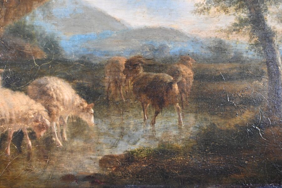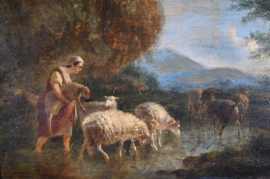 Le sujet de la bergère aux moutons abordé dans de nombreuses œuvres, est ici traité avec un jeu de luminosité très prononcé. Le troupeau sort de l’obscurité de la forêt se dirigeant vers les plaines et montagnes visibles en arrière-plan, pour y paître de longs mois.
